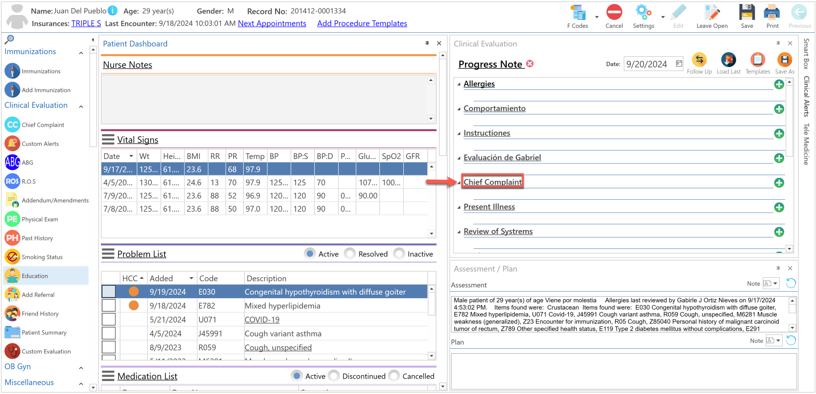 - Presione el botón de "Chief Complaint", localizado en la sección del "Side Bar".