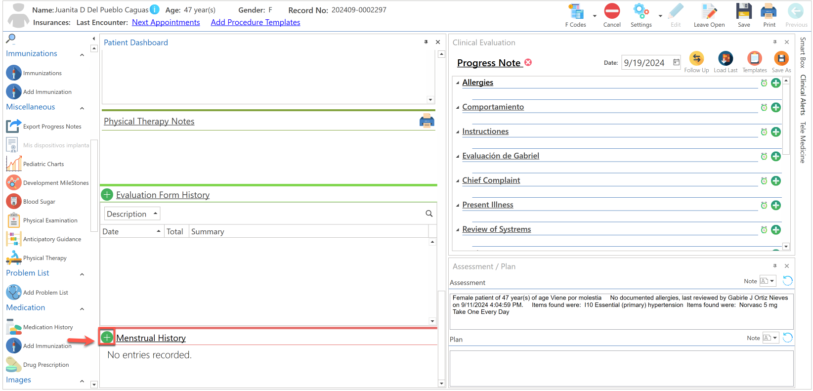 - Presione el enlace de "Menstrual History", en la sección del "Patient Dashboard".