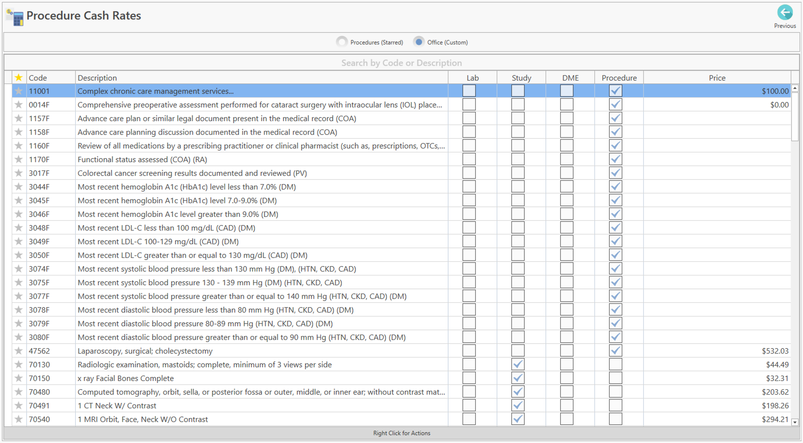 Procedure Cash Rates: Permite la clasificación y configuración de precios de procedimientos de la oficina o centro.