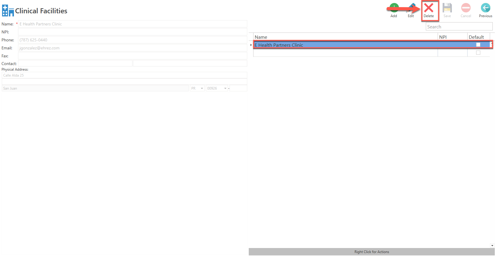 - Seleccione la instalación médica, que desea eliminar de la lista.