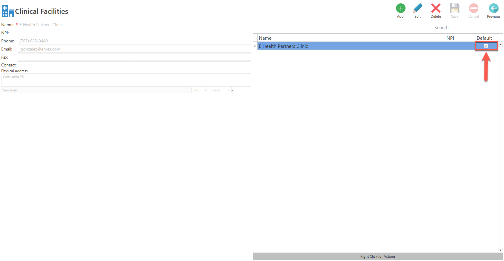 Seleccionando el encasillado "Default", localizado al lado de la instalación médica.