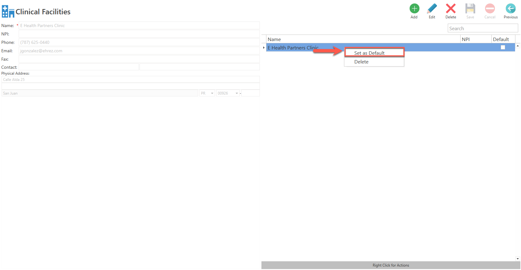- O, seleccione la instalación médica y presione el botón derecho del "mouse" y seleccione la opción de "Set As Default".
