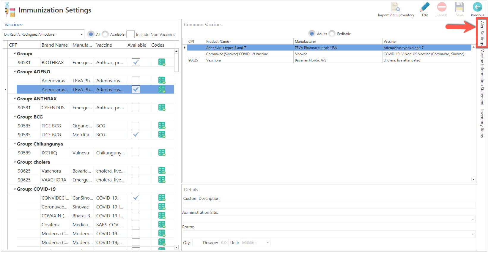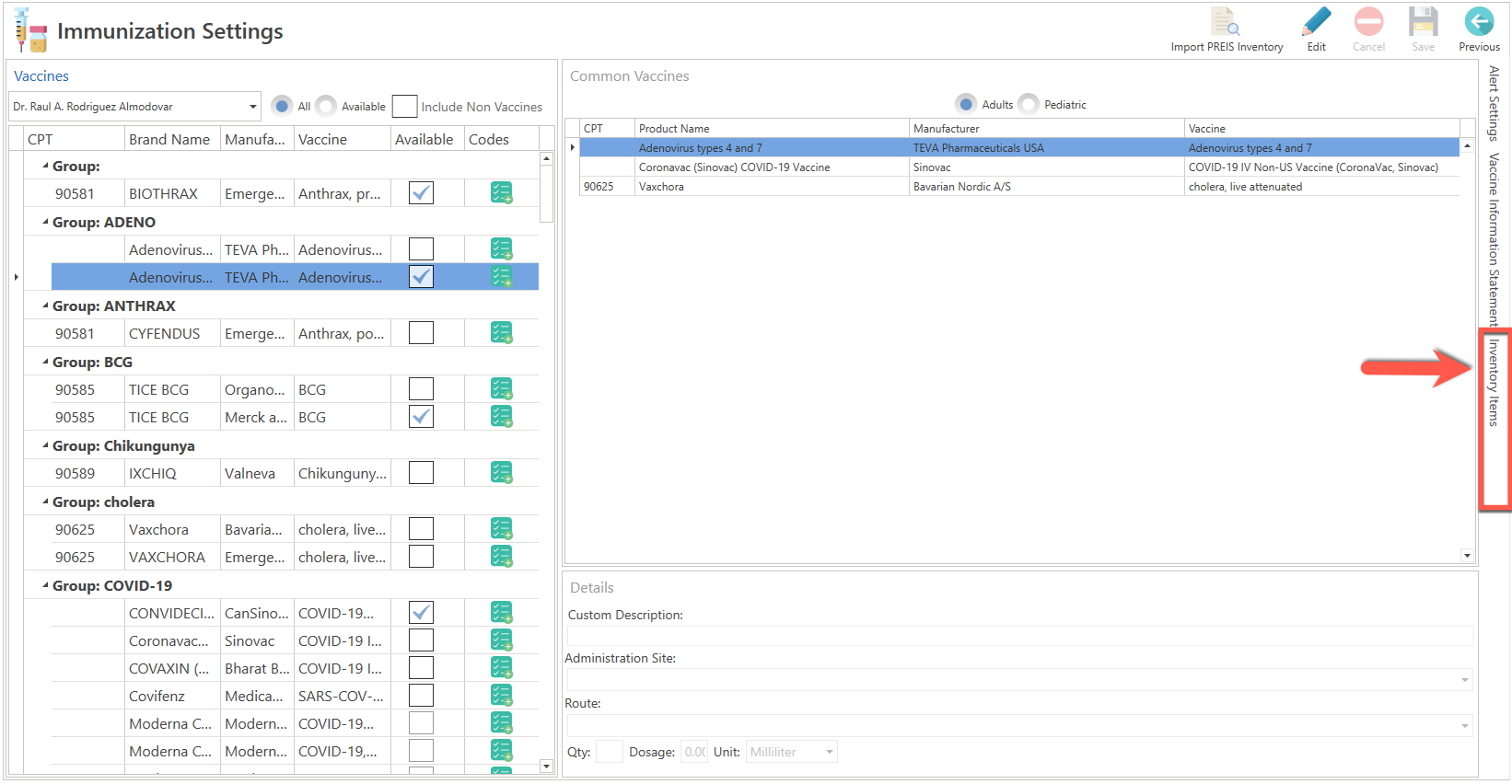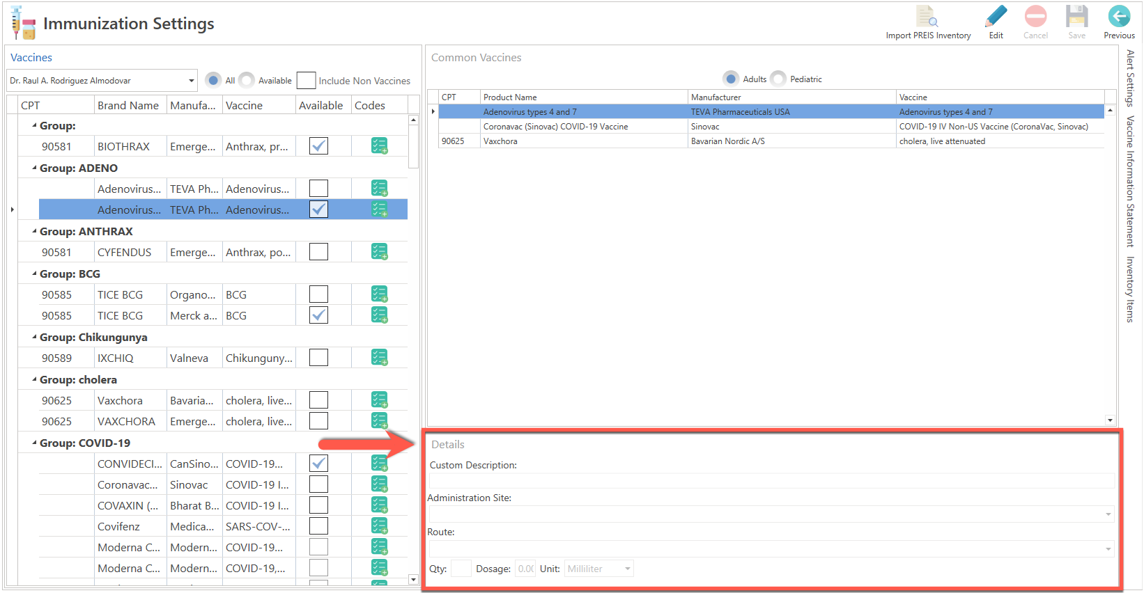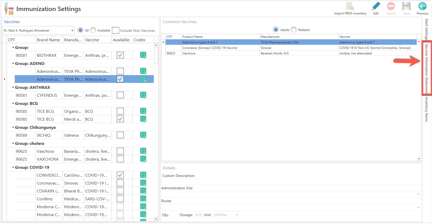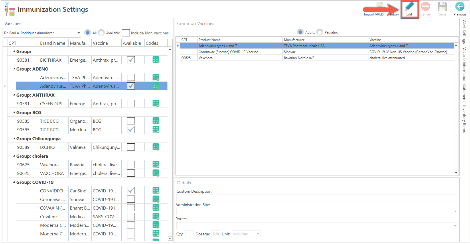 • Seleccione la vacuna que desea editar, en la sección de "Vaccines".