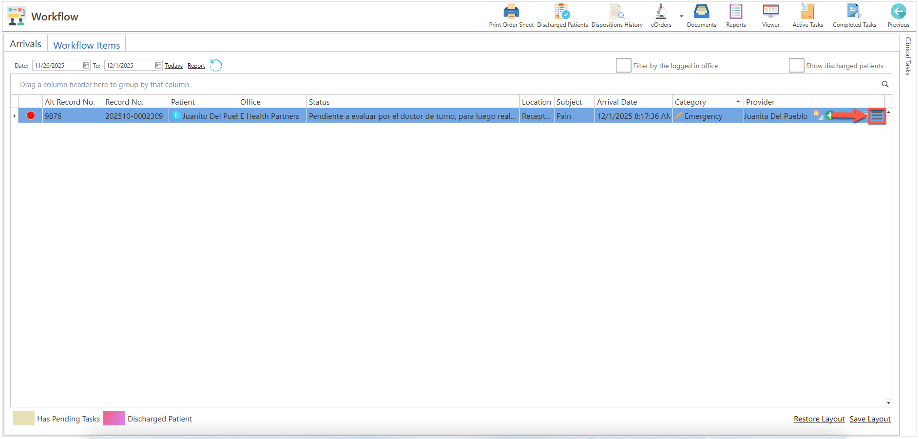 - El paciente se desplegará automáticamente, en los reportes de "Discharged Patients" y "Dispositions History". Estos se desplegarán, presionando ambos botones, en la parte superior de la pantalla.