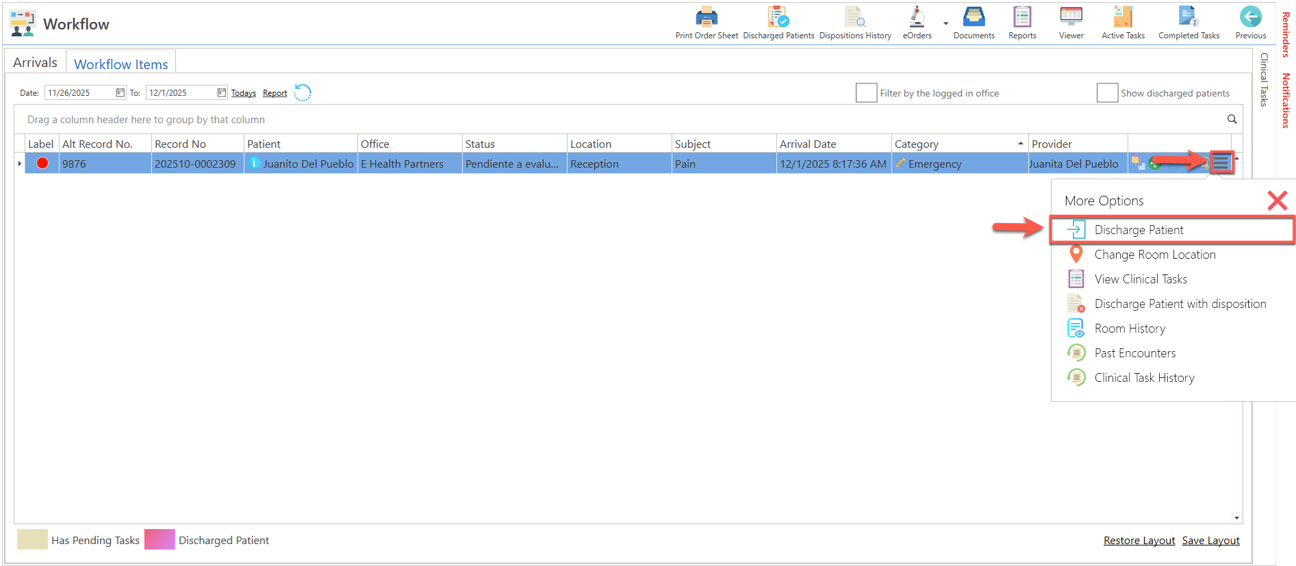 - Luego, presione el botón de "Discharge Patient", localizado en la parte extrema derecha del paciente seleccionado.