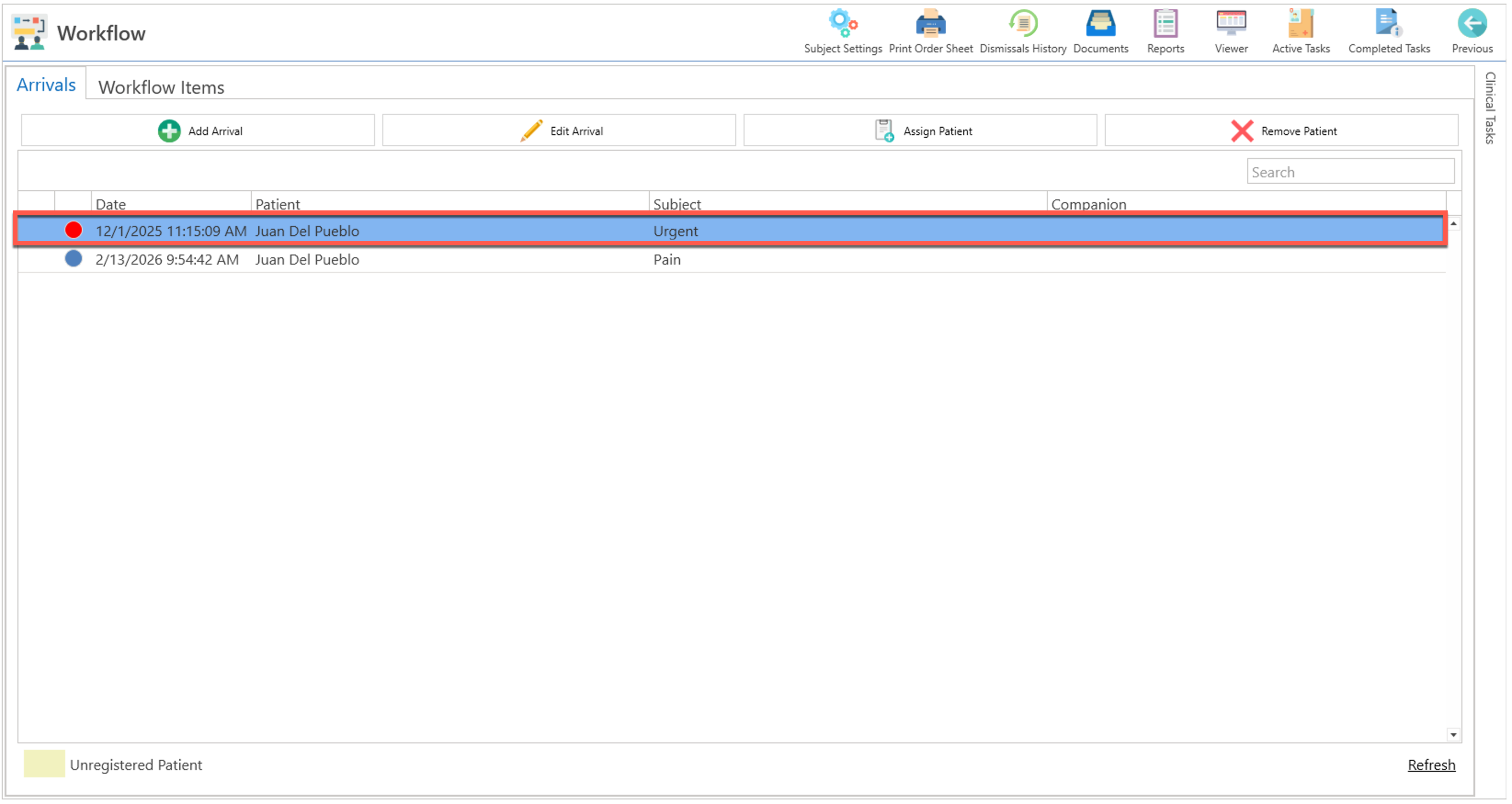 - El paciente aparecerá en la tabla de la sección "Arrivals".