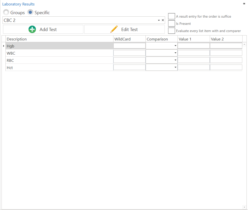 - Presione el botón de "Add Test", para agregar un laboratorio a la alerta.