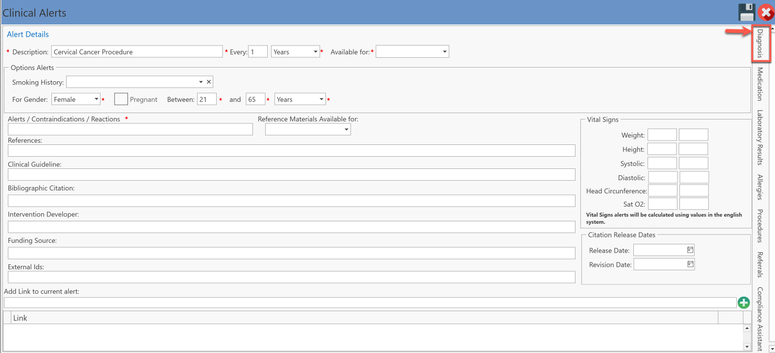 - Si desea agregar, algún diagnóstico, relacionado a esta alerta, presione la pestaña de "Diagnosis", localizada en la parte derecha de la pantalla.