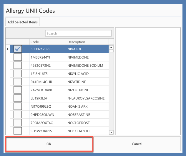 - Seleccione la substancia y luego, presione el botón de "Add Selected Items", localizado en la parte superior de la pantalla.