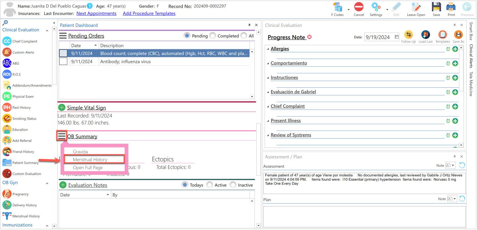 • Presione el enlace de "Menstrual History", en la sección del "Patient Dashboard".