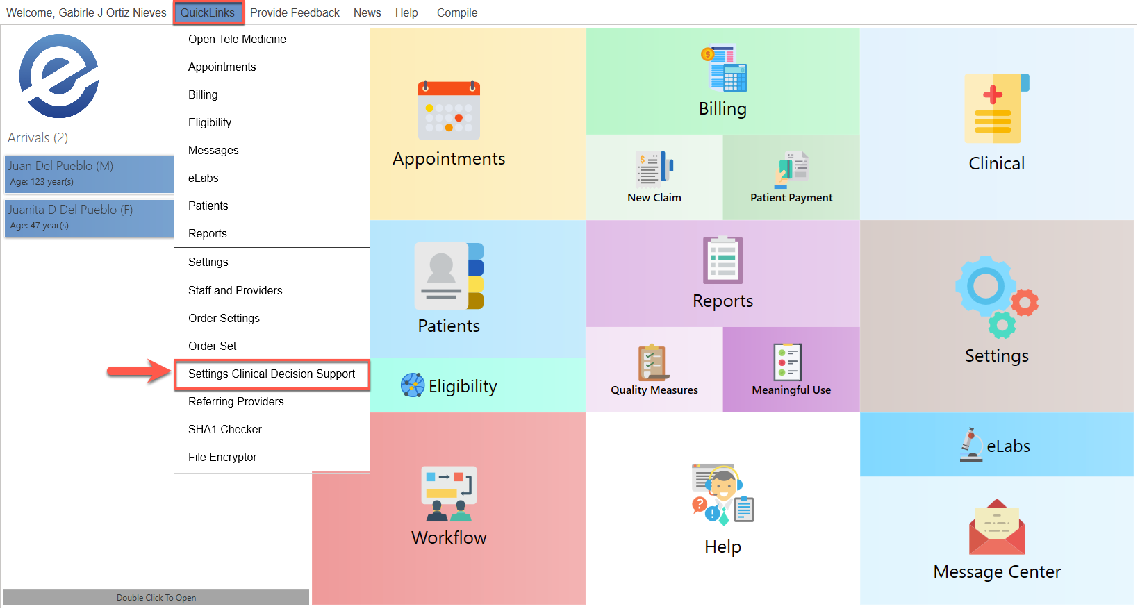 - Presione el texto de "QuickLinks", localizado en la parte superior de la pantalla y seleccione la opción de "Settings Clinical Decision Support".