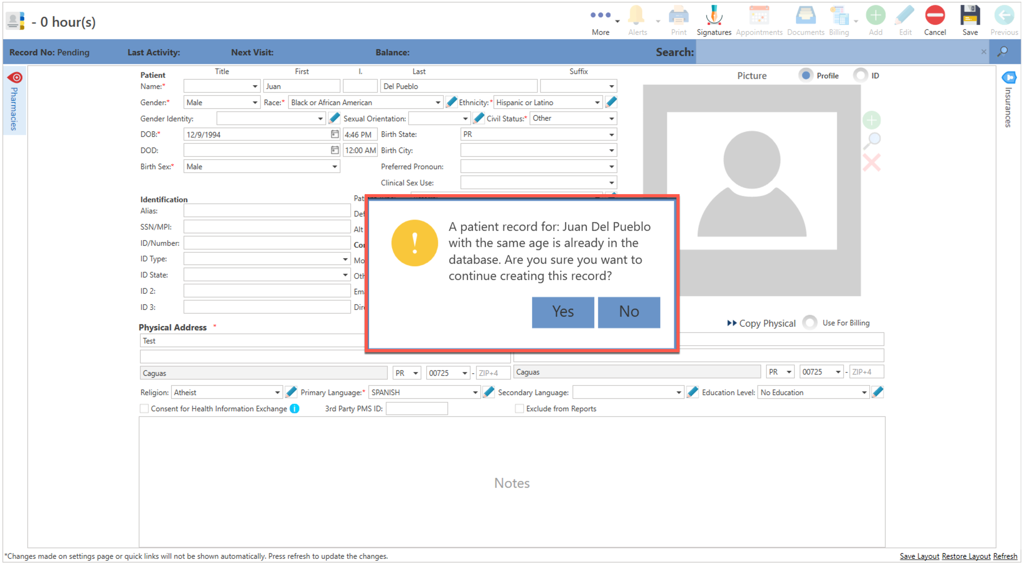 - Si aún desea continuar con el registro del récord del paciente, presione el botón de "Yes".