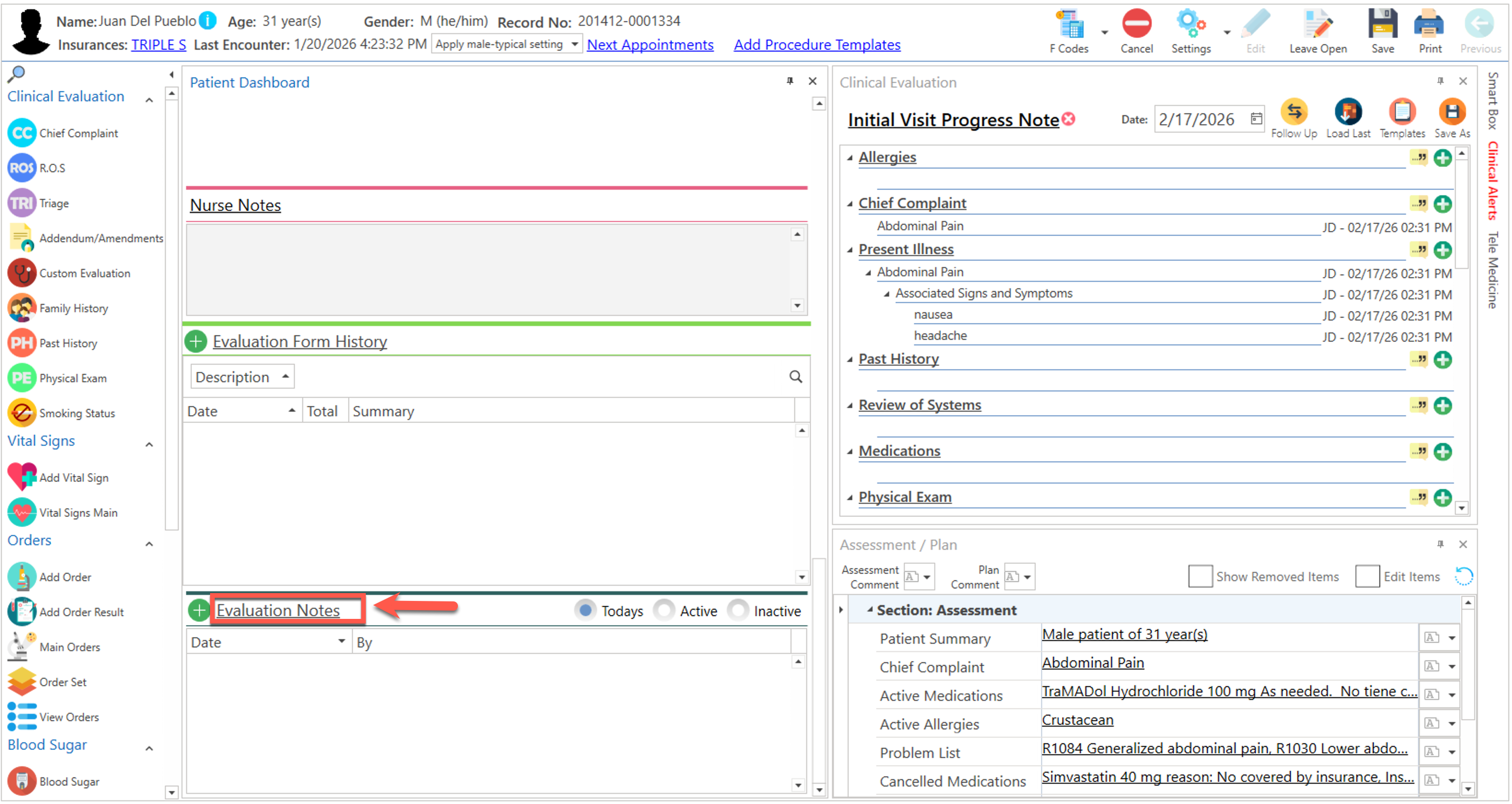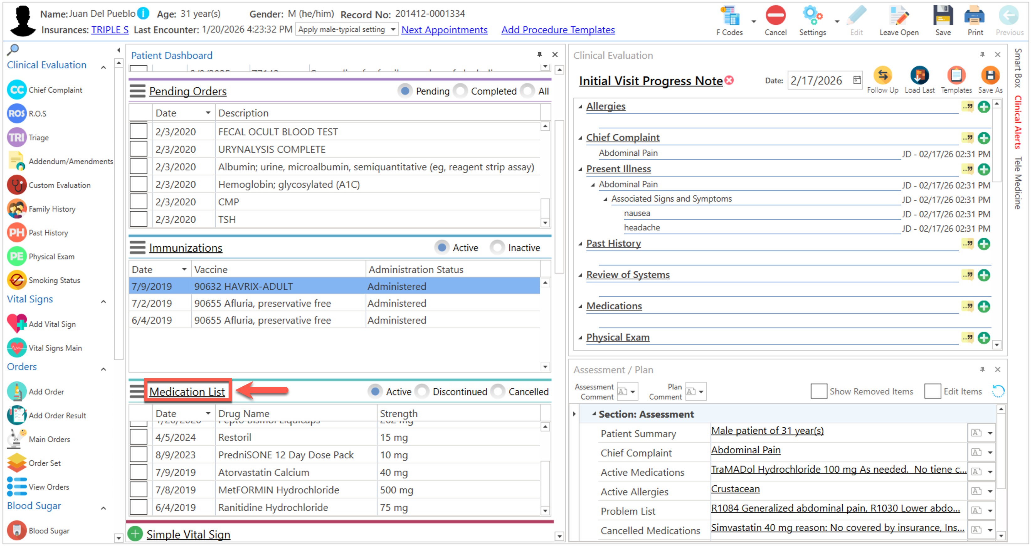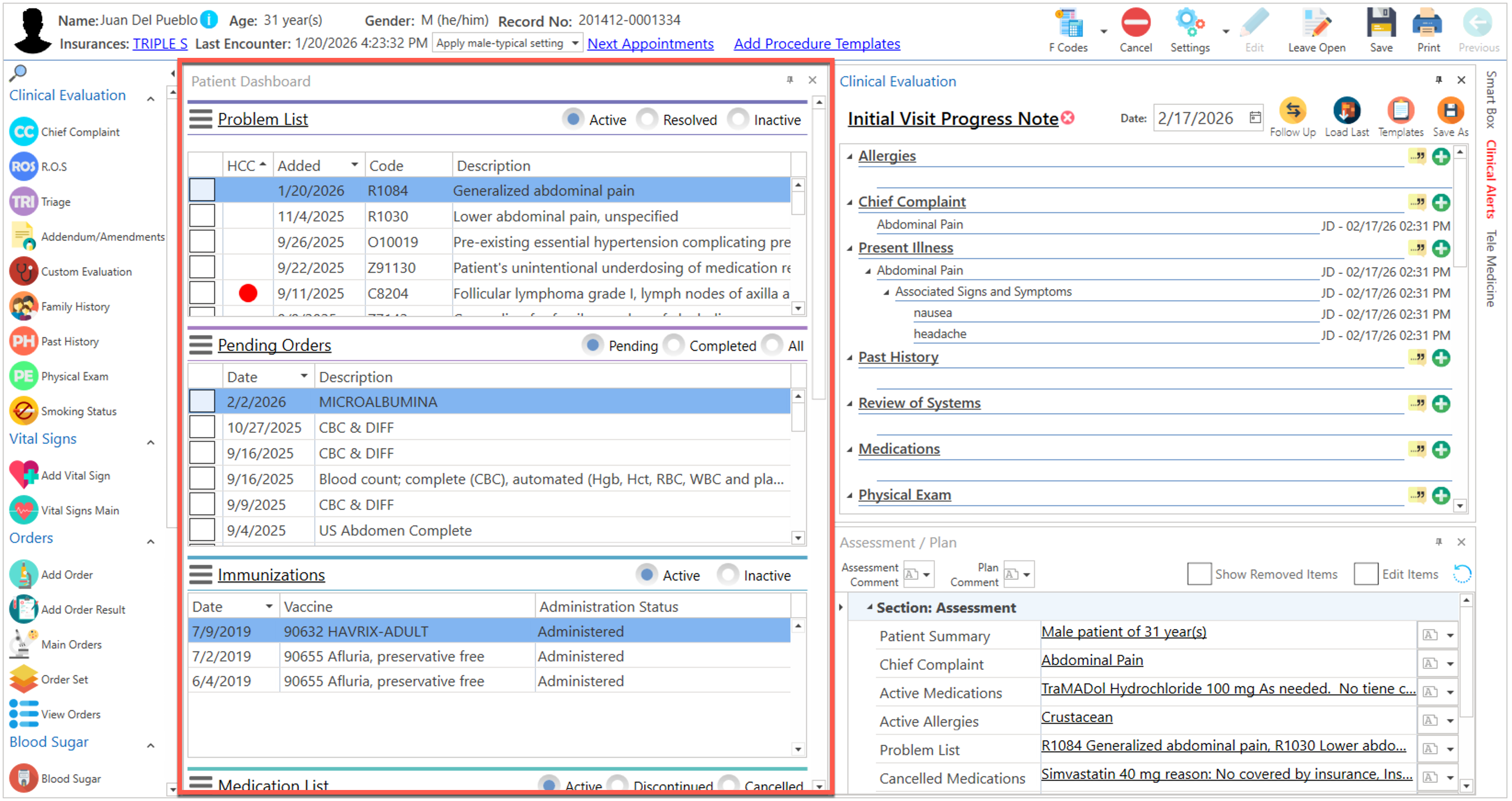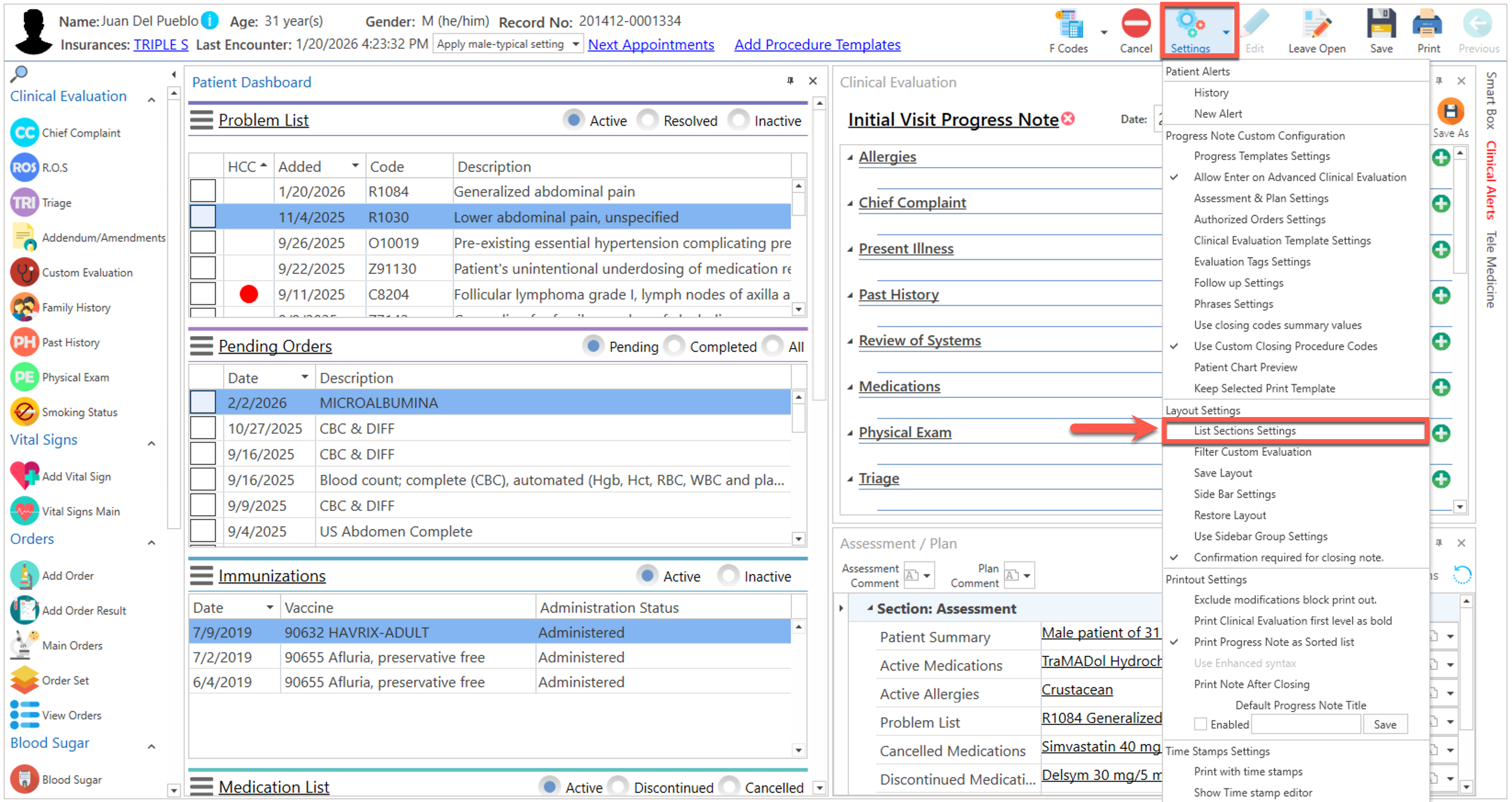 Sección para manejar con fácil acceso, el historial clínico del paciente entre otras. (Nota: Esta sección se configura en la pantalla de "Advanced Progress Notes / Settings / List Sections Settings".)