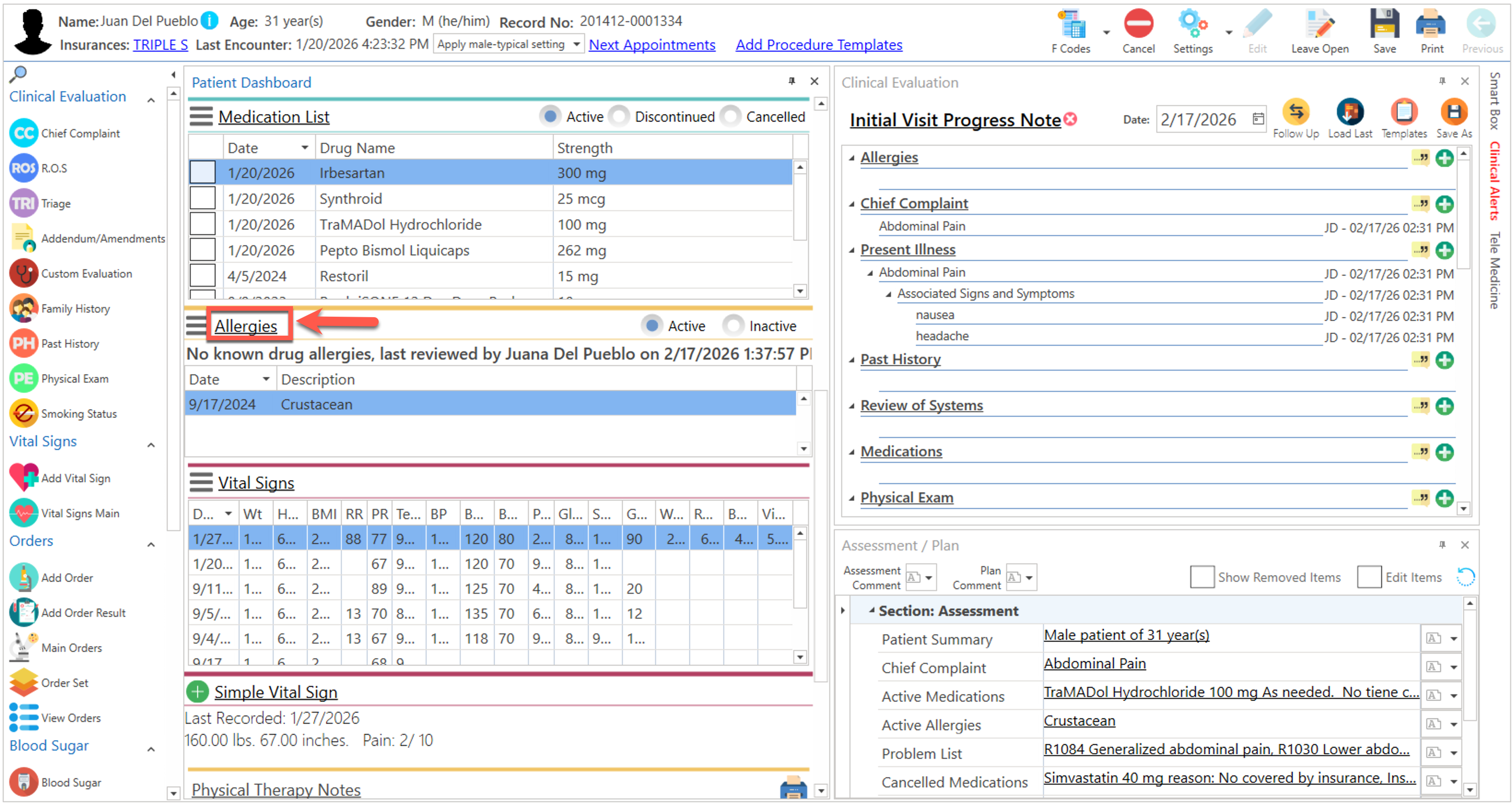 - Al presionar sobre el enlace de "Allergies", se desplegará la pantalla principal de "Allergies & Adverse Reactions".