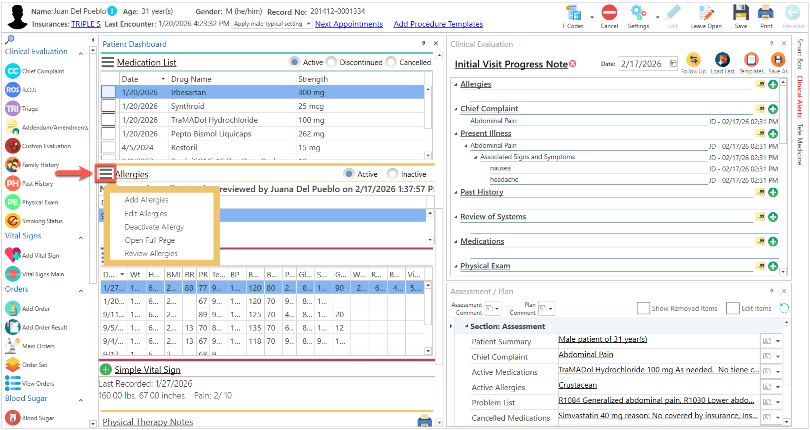 - Al presionar sobre el botón de "More", localizado al lado del enlace de "Allergies" o presionar el botón derecho del "mouse", se desplegarán las siguientes opciones: