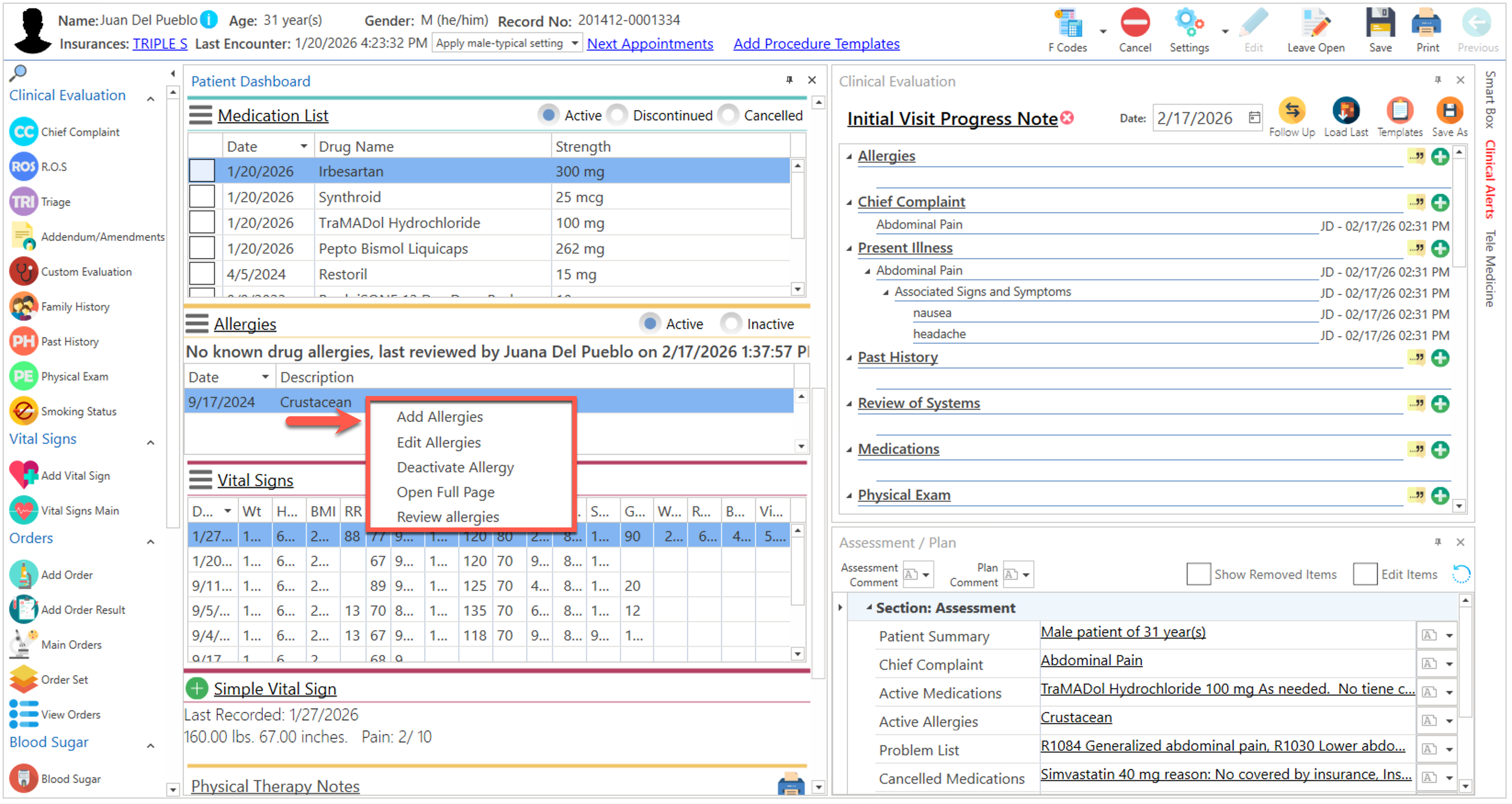 - Add Allergies: Al presionar, se desplegará la pantalla pequeña, para registrar las alergias del paciente.