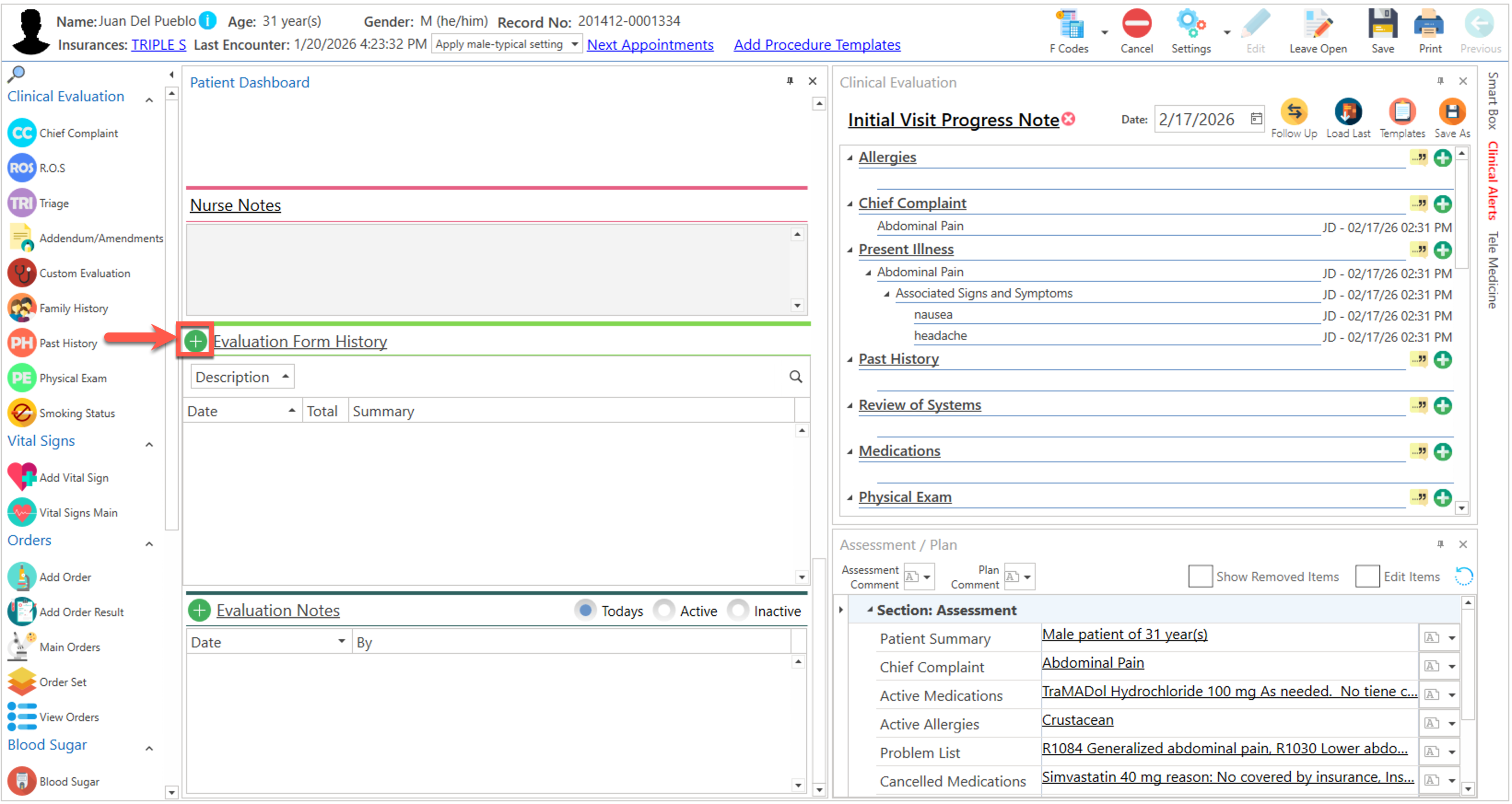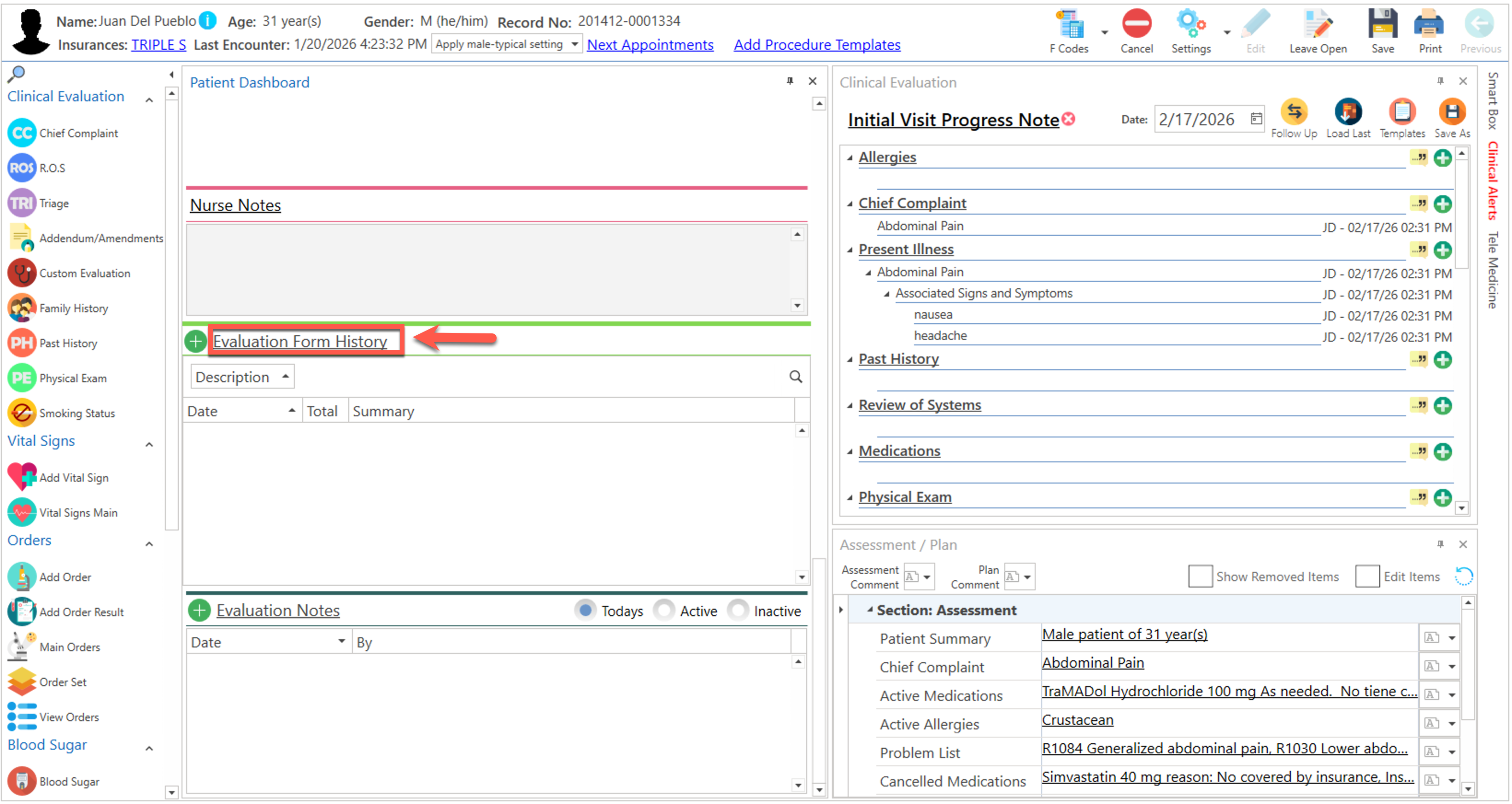 - Al presionar sobre el enlace de "Evaluation Form History" o presionar sobre el botón de "Add", se desplegará la pantalla principal de "Evaluation Form", para registrar la evaluación de cuestionarios del paciente.