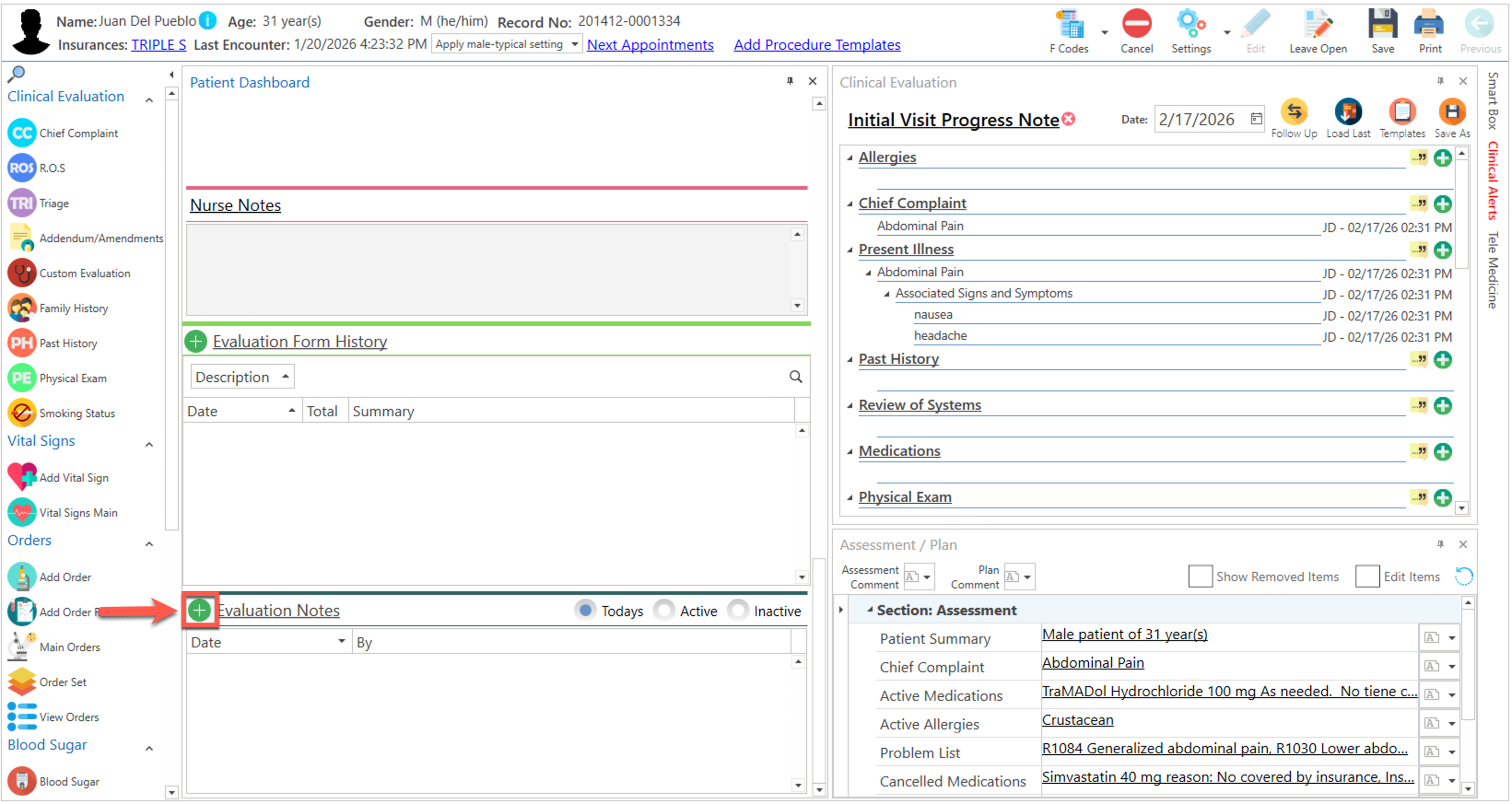 - Al presionar sobre el enlace o el botón de "Add", se desplegará la pantalla que se utiliza, para registrar notas específicas sobre las evaluaciones. Las mismas podrán ser filtradas, por las notas de evaluación del día del encuentro o todas las notas de evaluación en general del paciente.