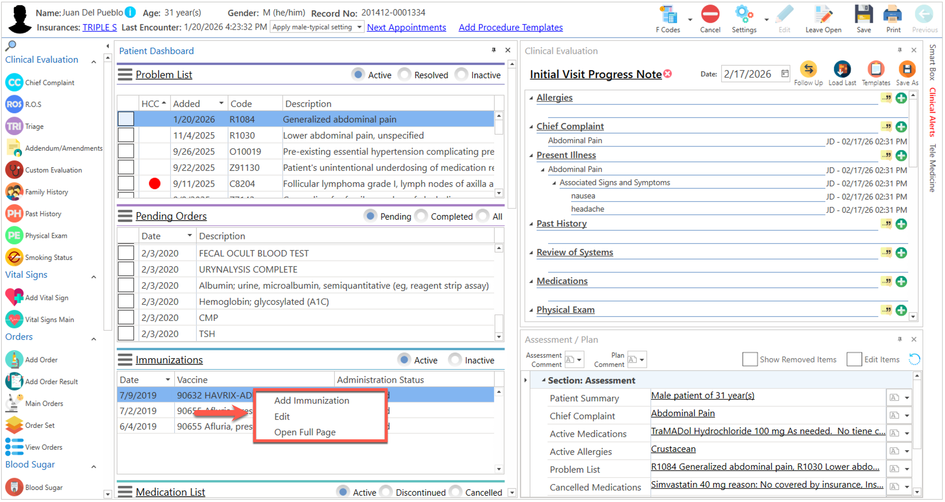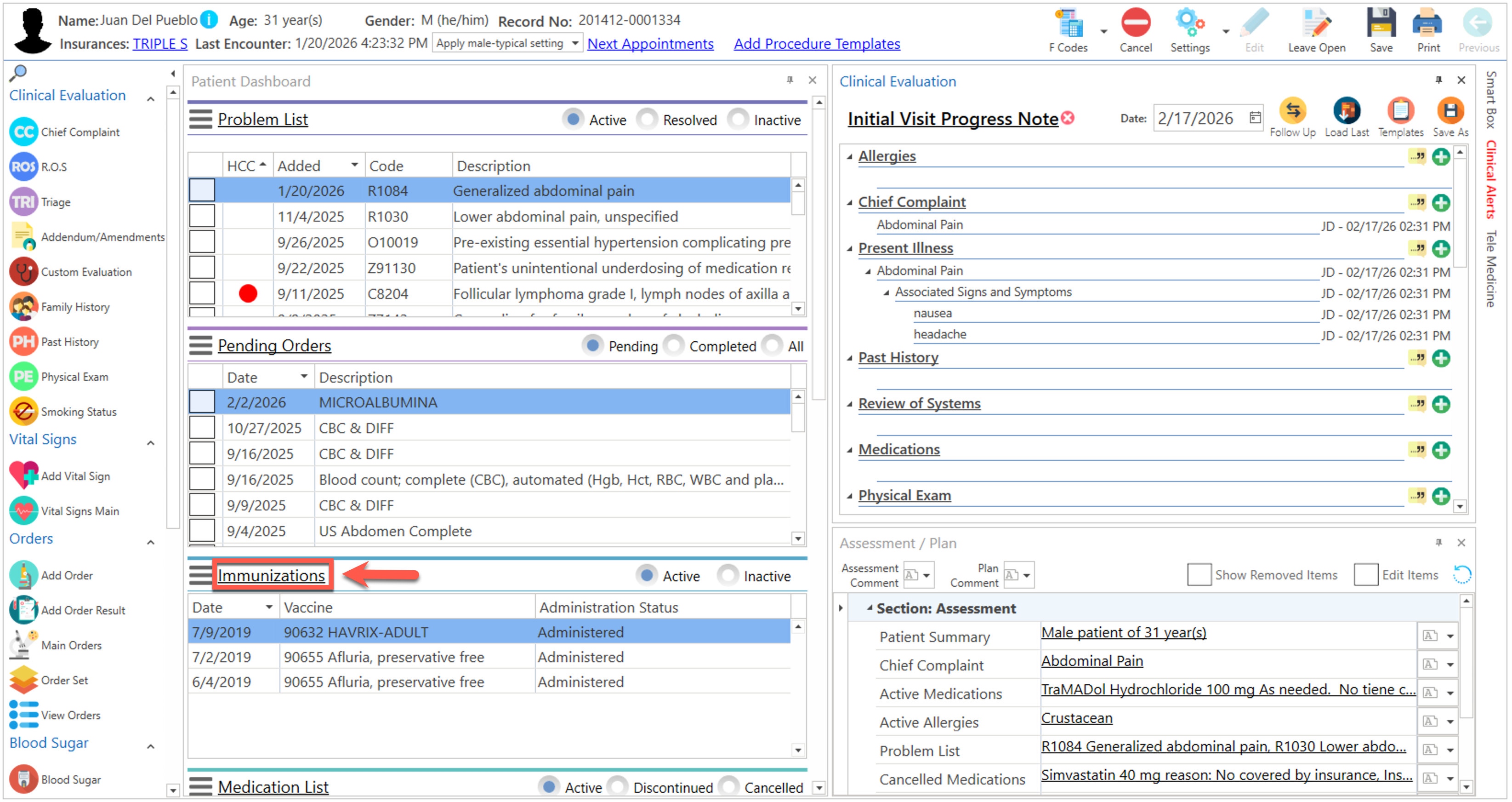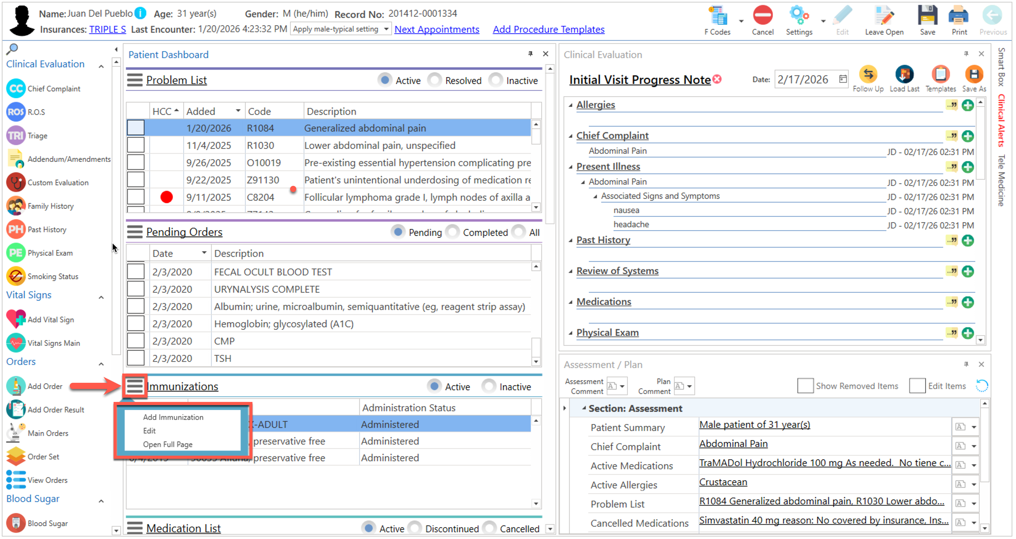 - Add Immunization: Al presionar, se desplegará la pantalla pequeña para registrar las vacunas administradas al paciente.