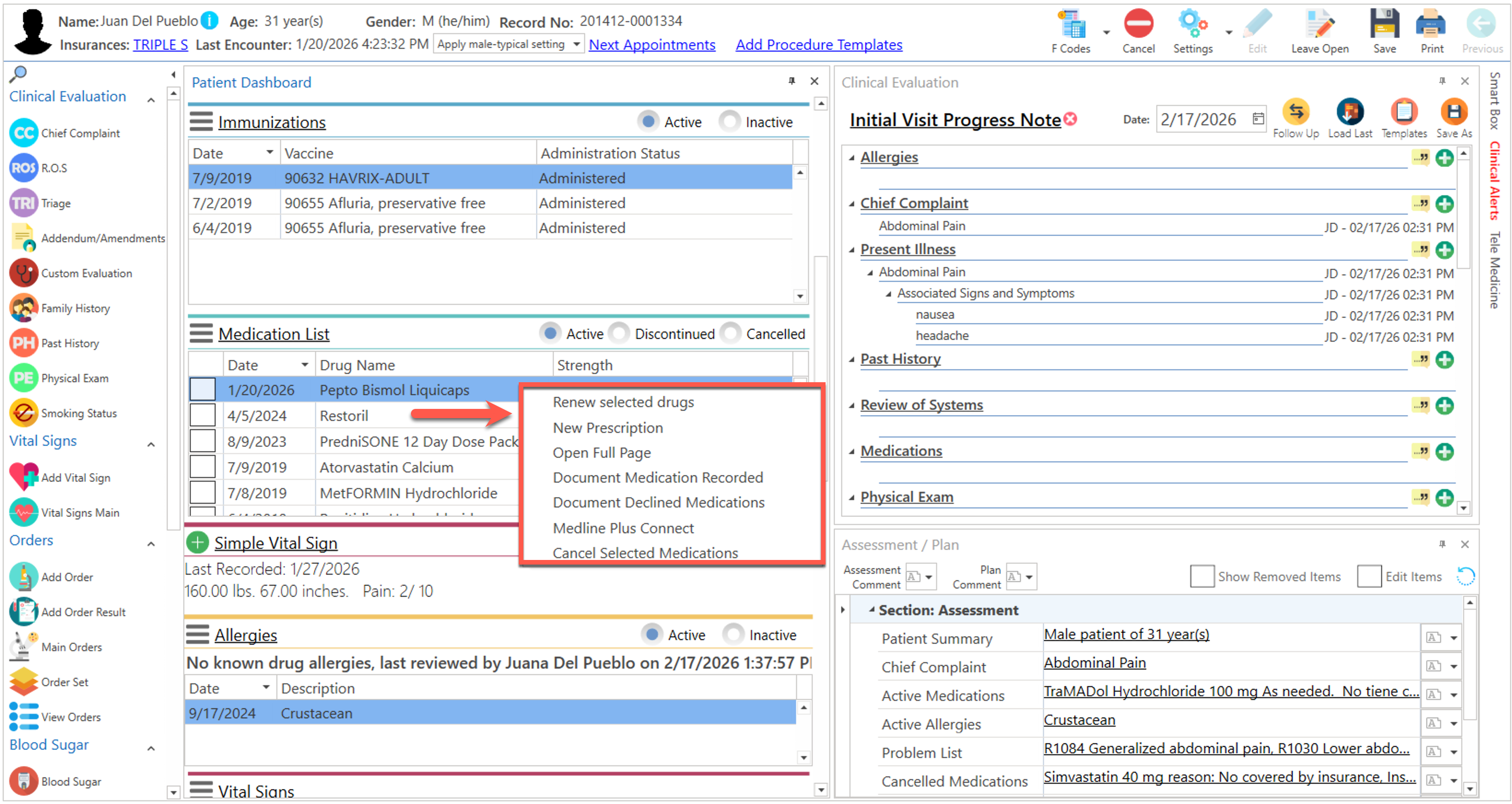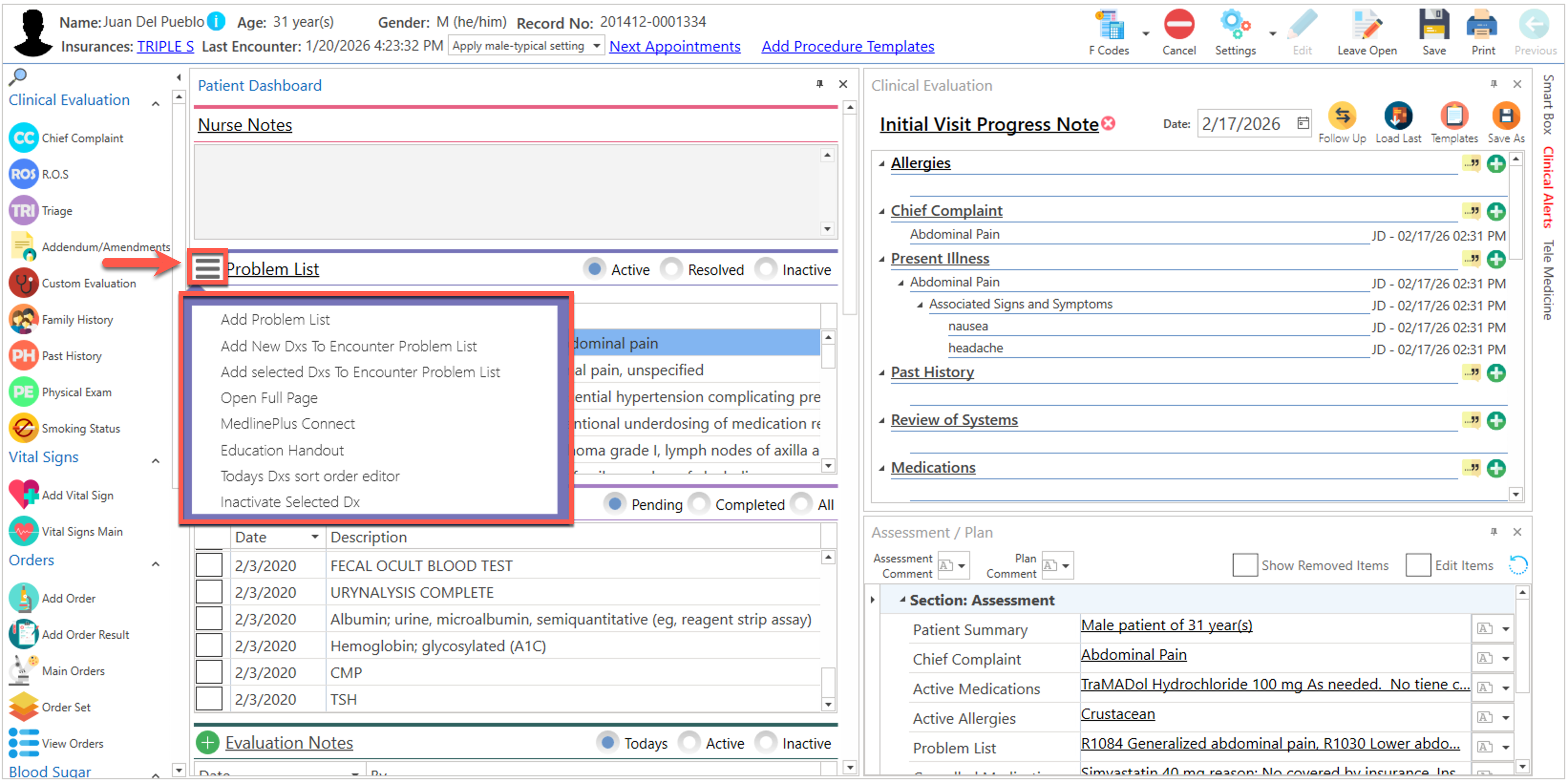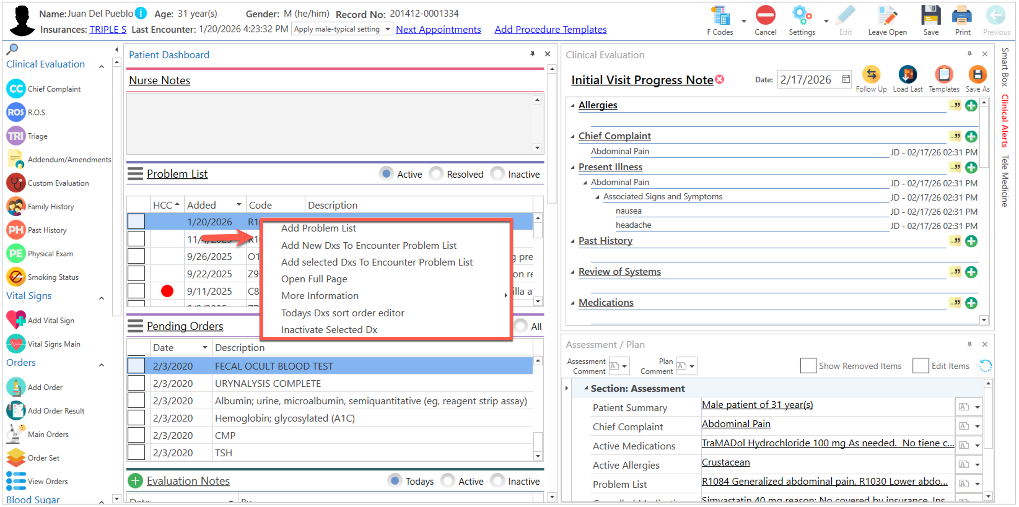 - Add selected Dxs To Encounter Problem List: Al seleccionar un encuentro y luego esta opción, permite agregar el diagnóstico seleccionado, de la lista de los diagnósticos del paciente al encuentro actual.