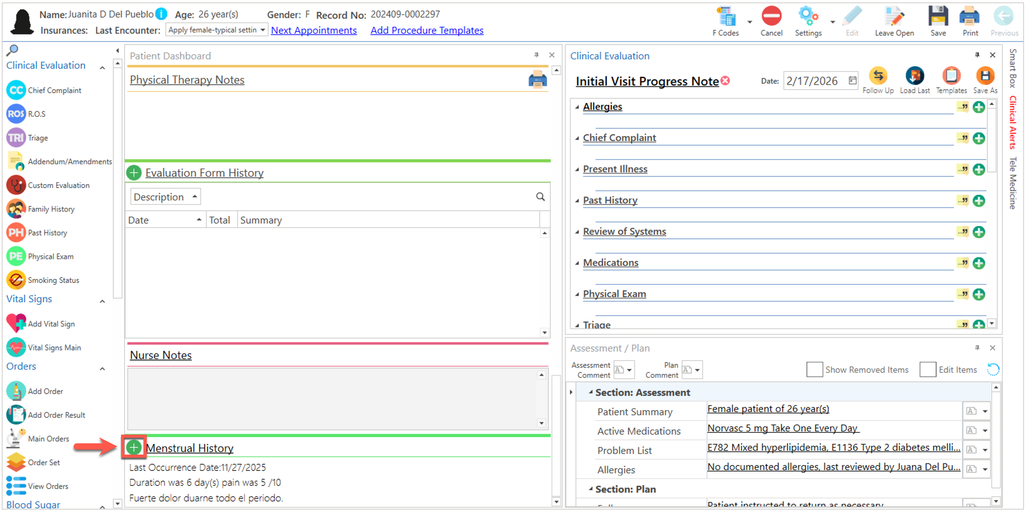 - Menstrual History: Al presionar, se desplegará la pantalla principal, para registrar el historial de período menstrual de la paciente.