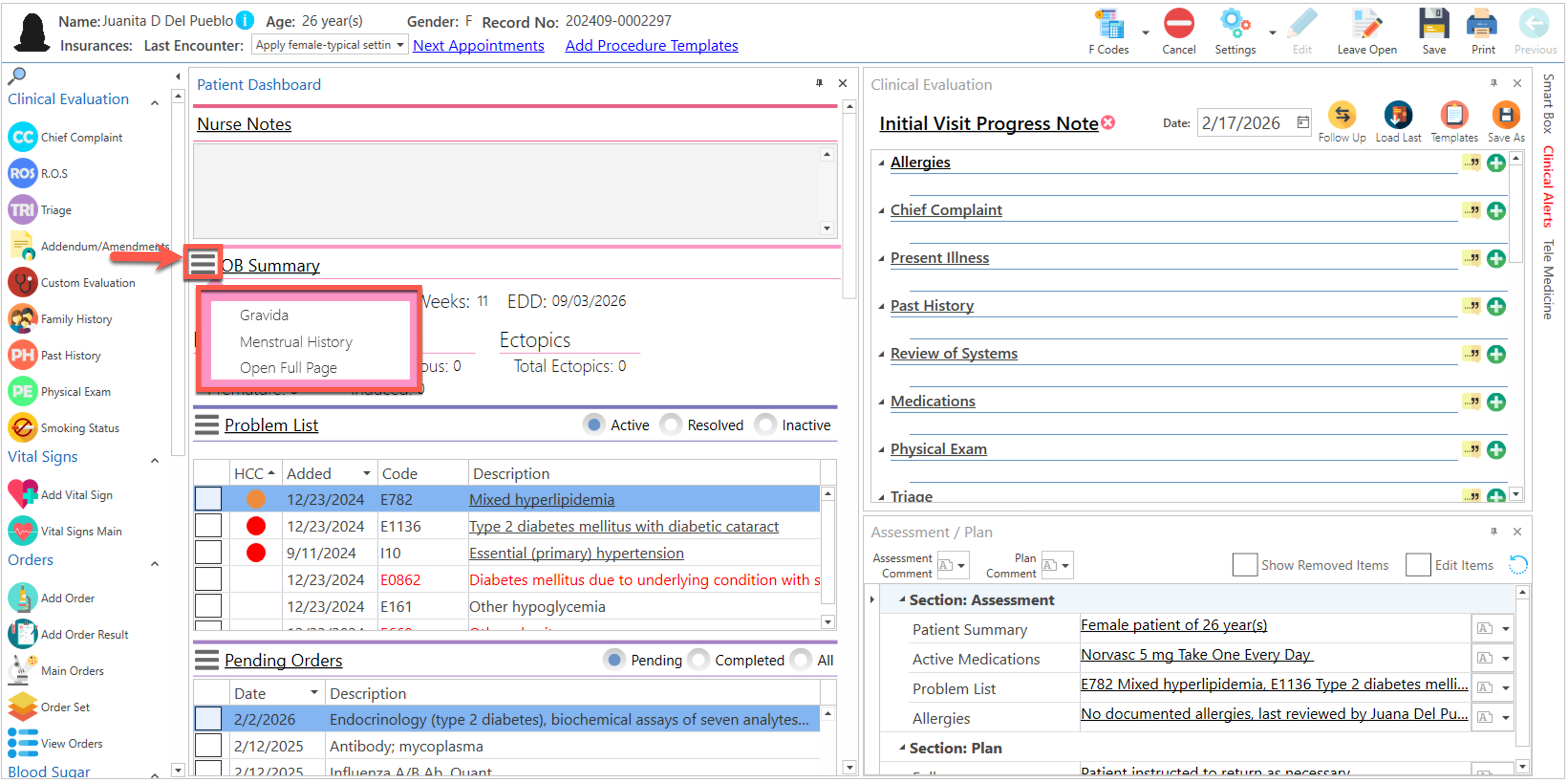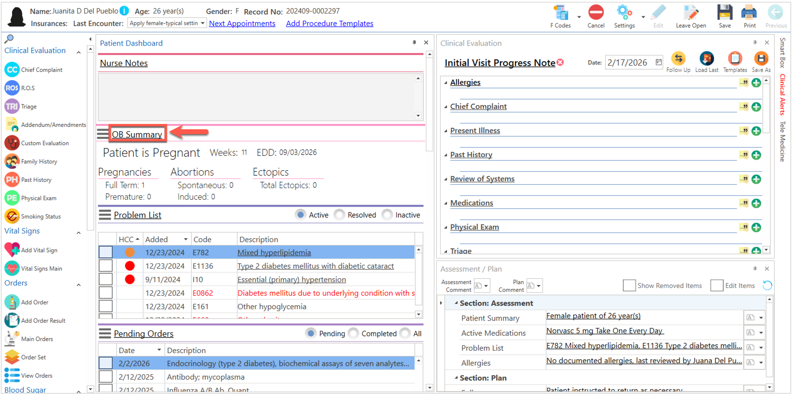 - Al presionar sobre el enlace de "OB Summary", se desplegará la pantalla principal, para registrar la información del embarazo y signos vitales de la paciente.