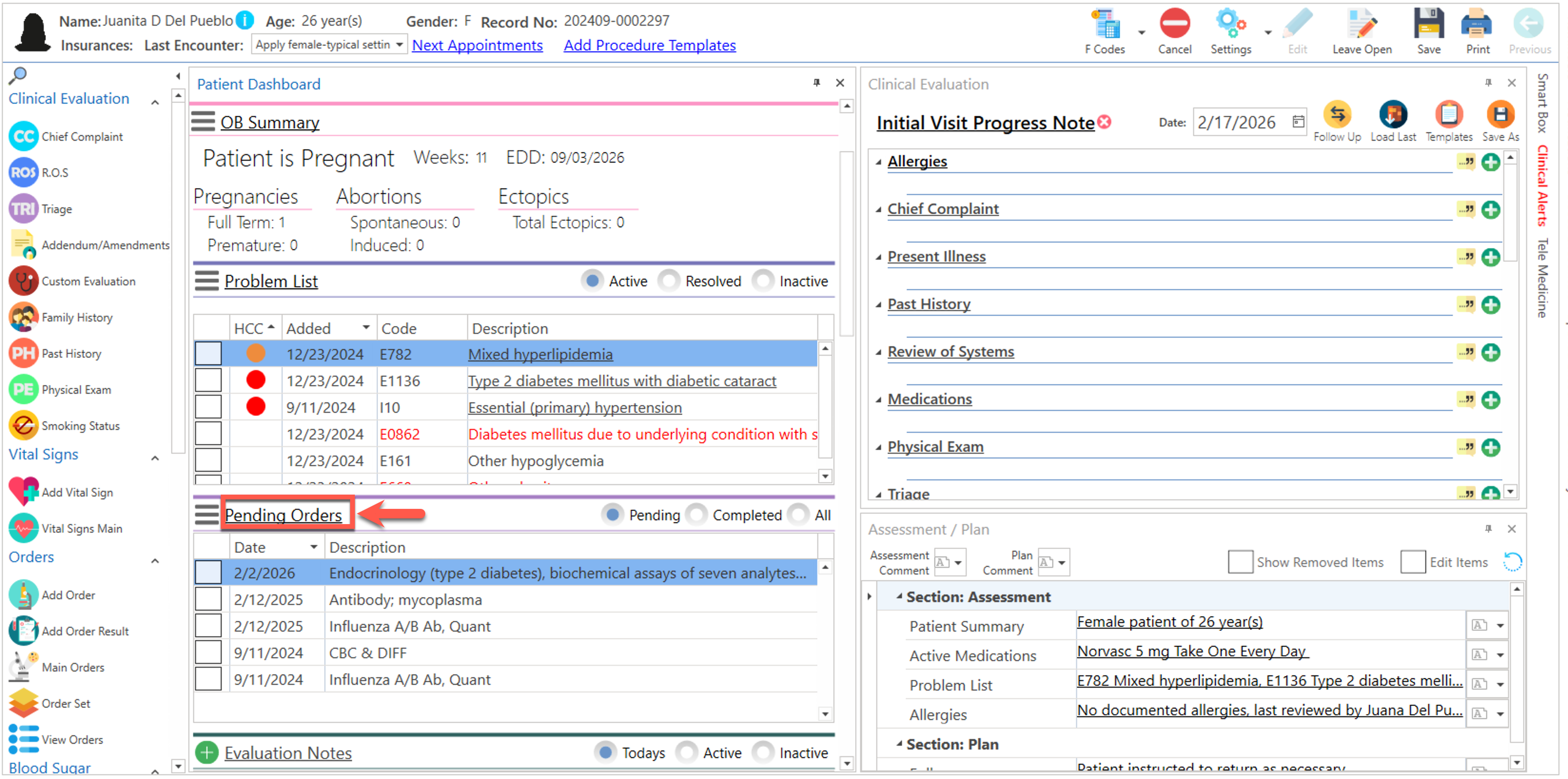 - Al presionar sobre el enlace de "Pending Orders", se desplegará la pantalla principal, donde se crean las órdenes de laboratorio, imágenes y procedimientos. En esta pantalla, se podrán visualizar las órdenes pendientes (Primera tabla), las órdenes con los resultados (Segunda tabla) y los resultados (Tercera tabla).