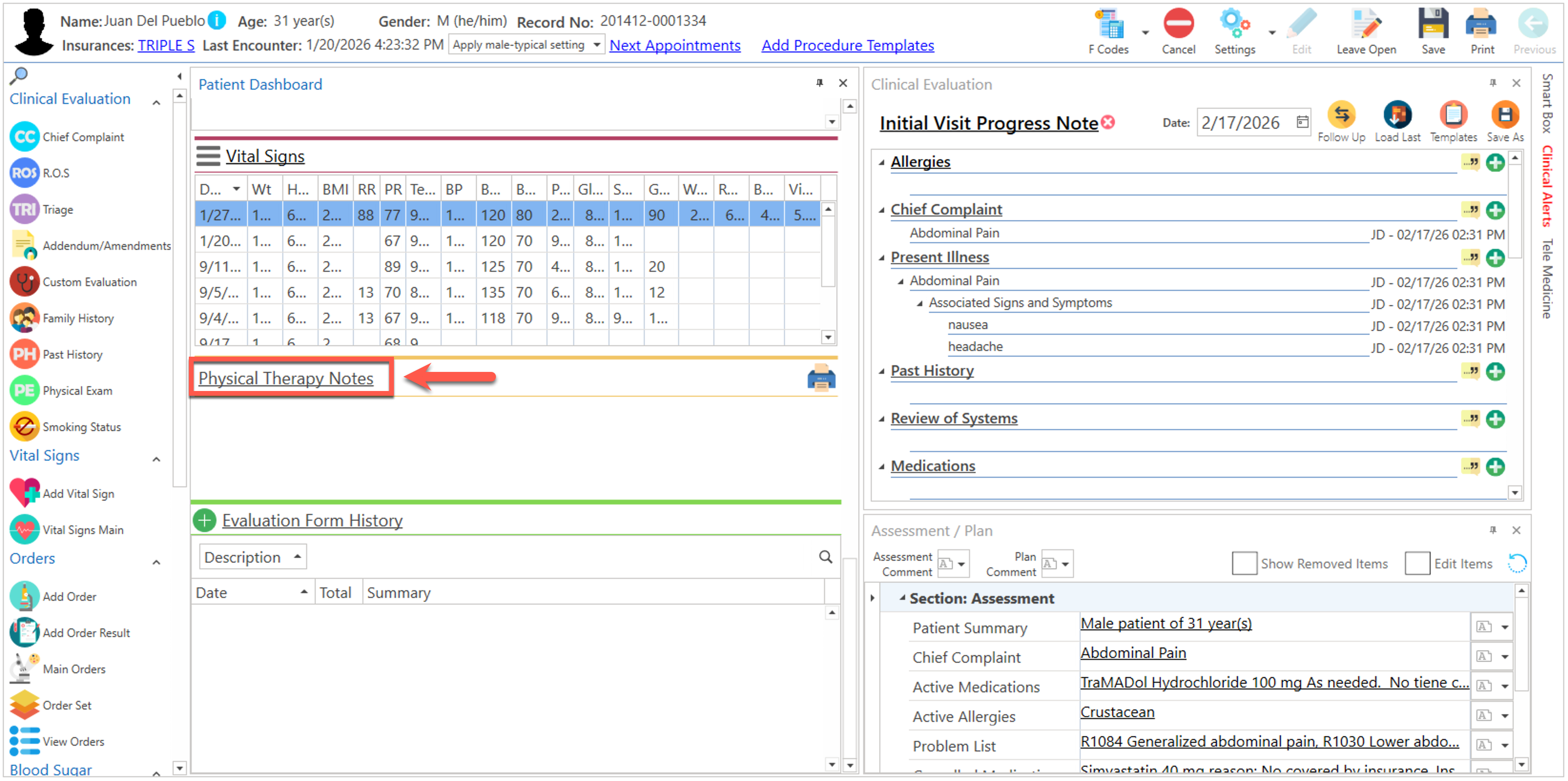 - Al presionar sobre el enlace de "Physical Therapy Notes", se desplegará la pantalla principal, para documentar la terapia física del paciente.