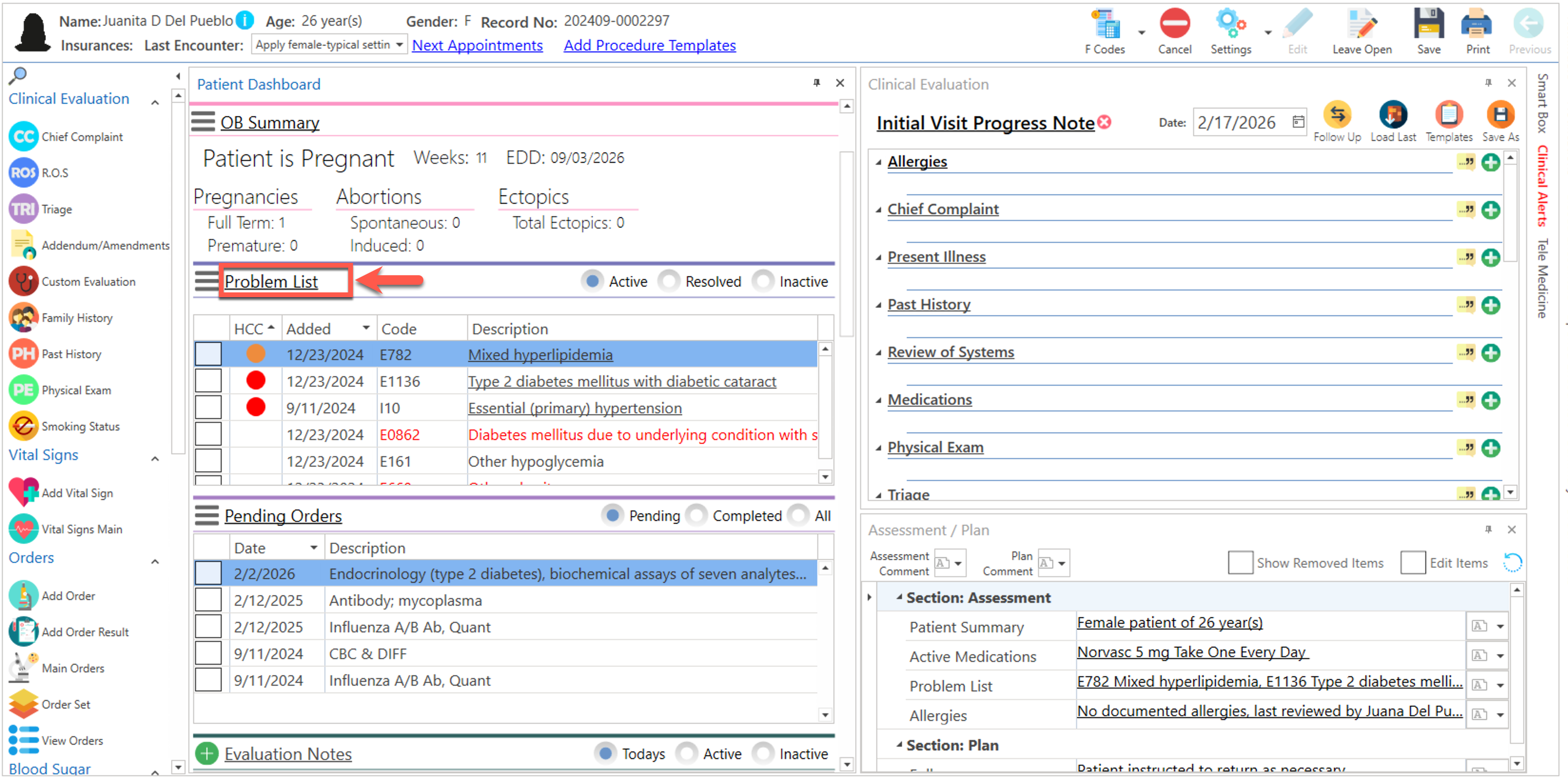 - Add Problem List: Al seleccionar, permite agregar el diagnóstico del paciente.