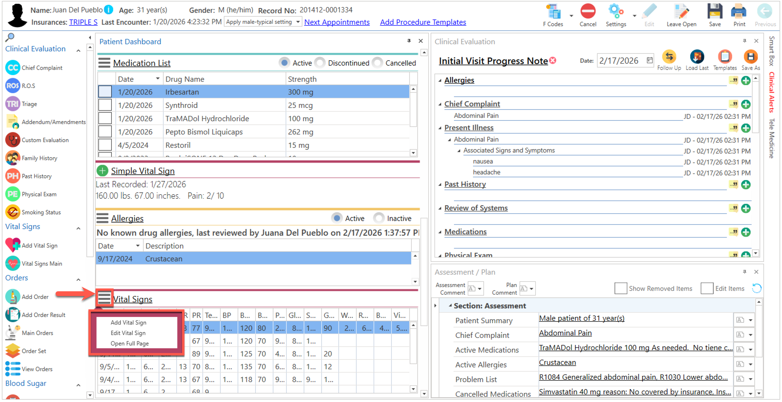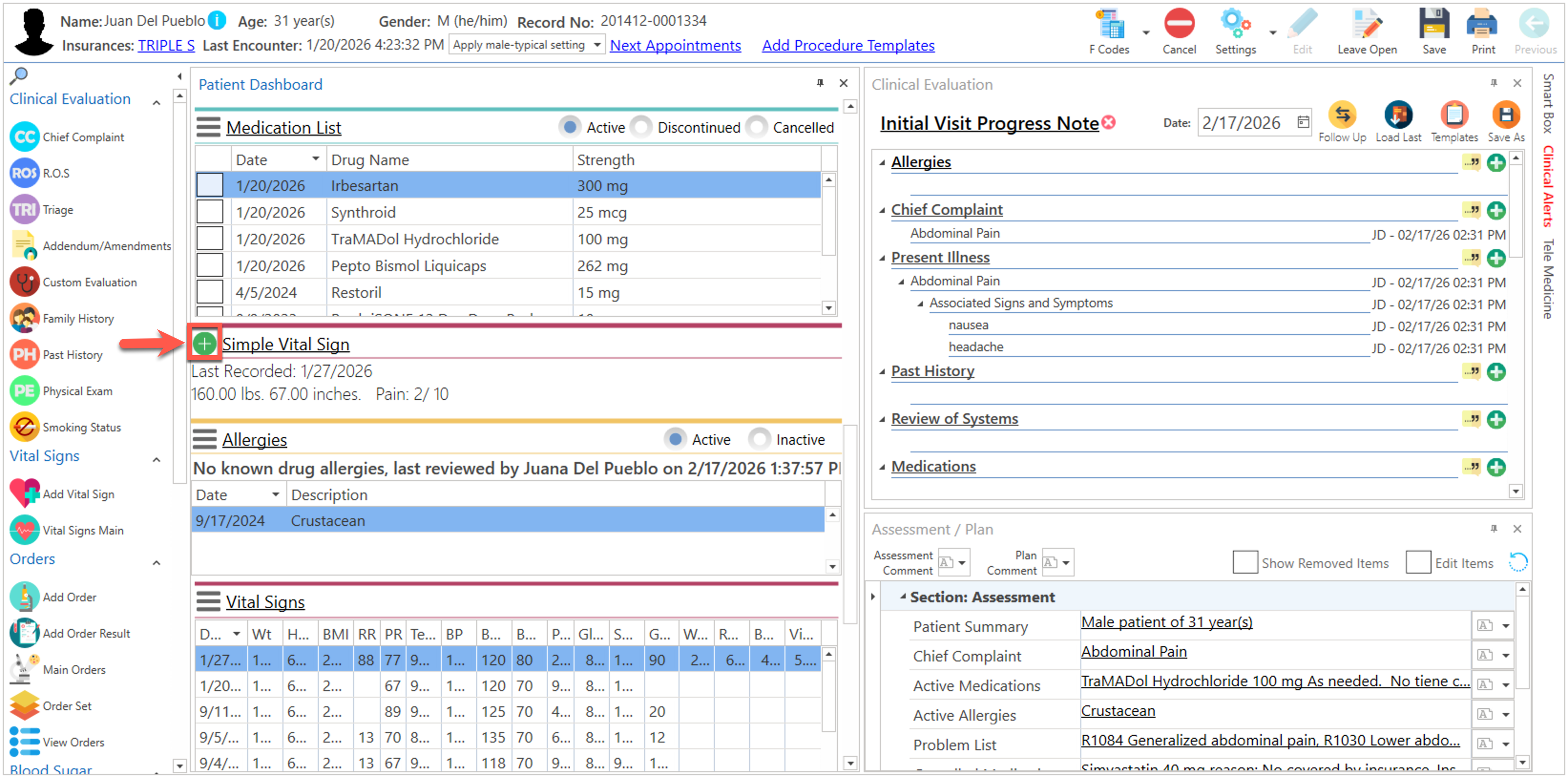 - Add Vital Sign: Al seleccionar, desplegará la pantalla pequeña, para el registro de los vitales del paciente.
