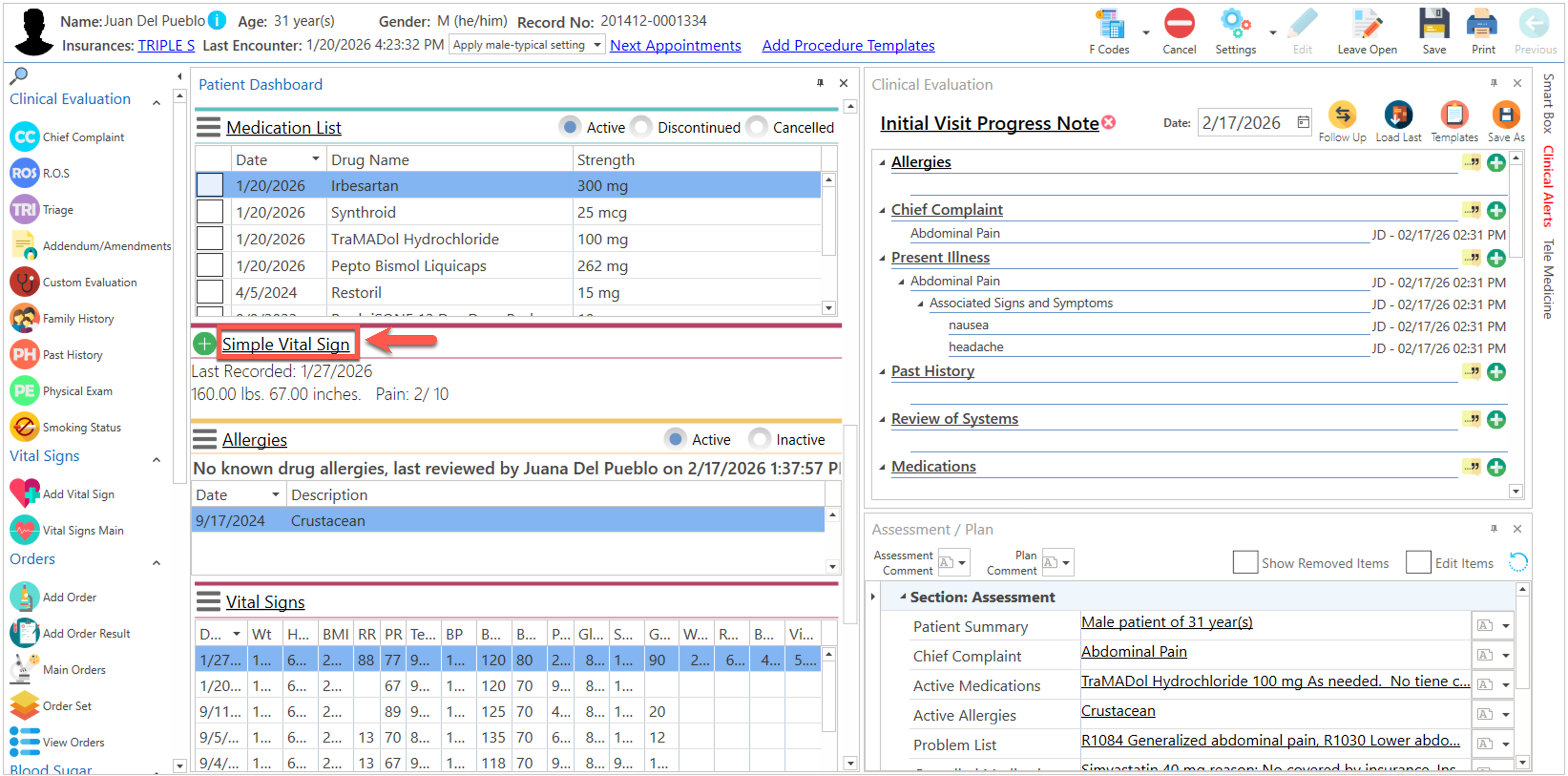 - Al presionar sobre el enlace de "Simple Vital Signs", se desplegará la pantalla principal, para el registro de los signos vitales del paciente.