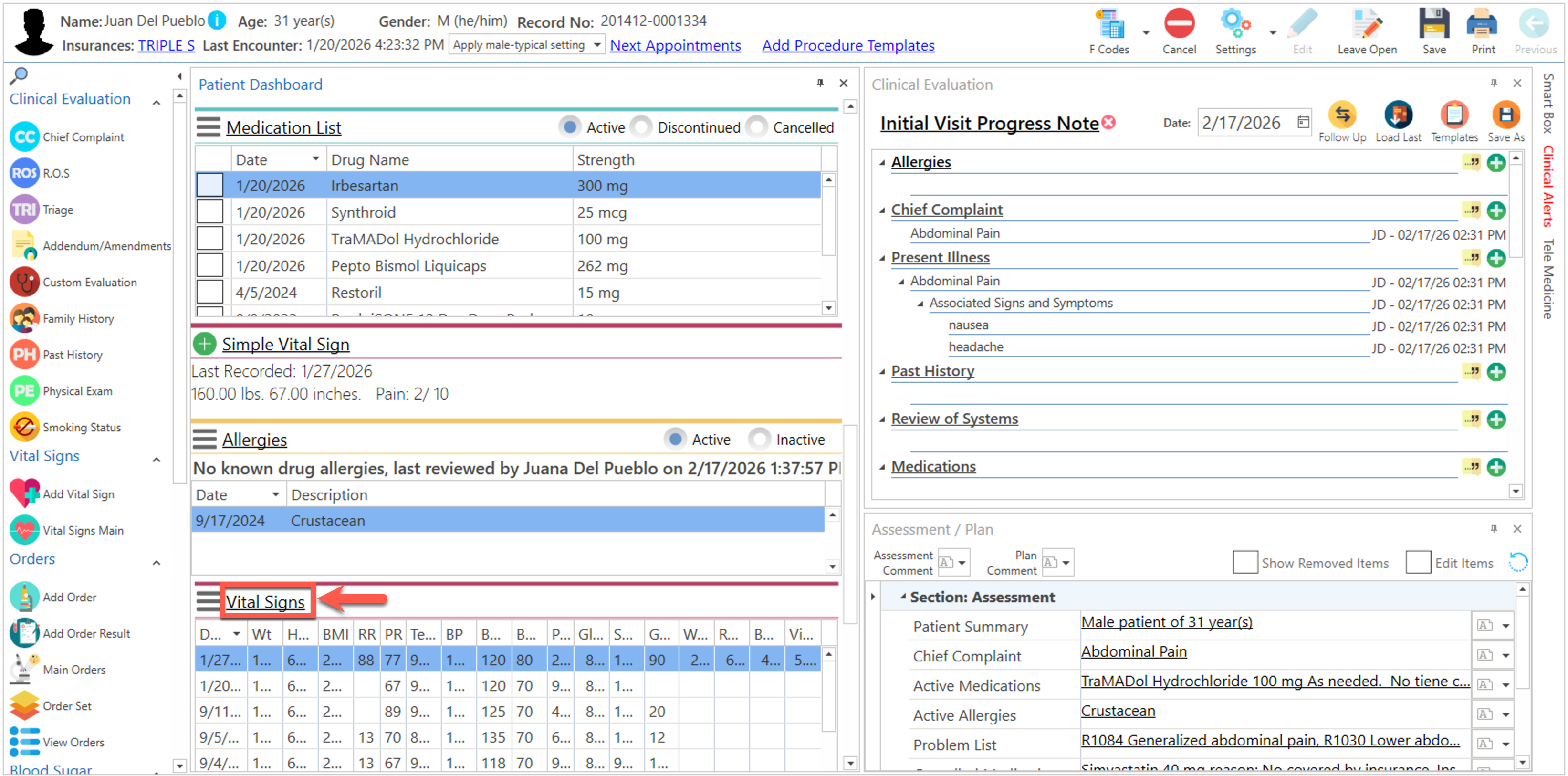 - Al presionar sobre el enlace de "Vital Signs", se desplegará la pantalla principal, para registrar los signos vitales del paciente.
