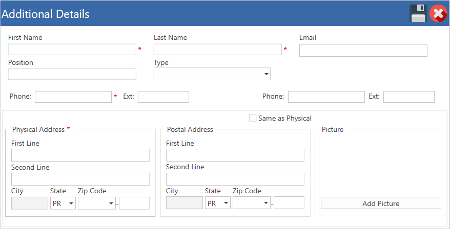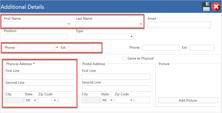 - Llene todos los campos requeridos que aparecen con un *: Nombre, apellido, teléfono y dirección física.