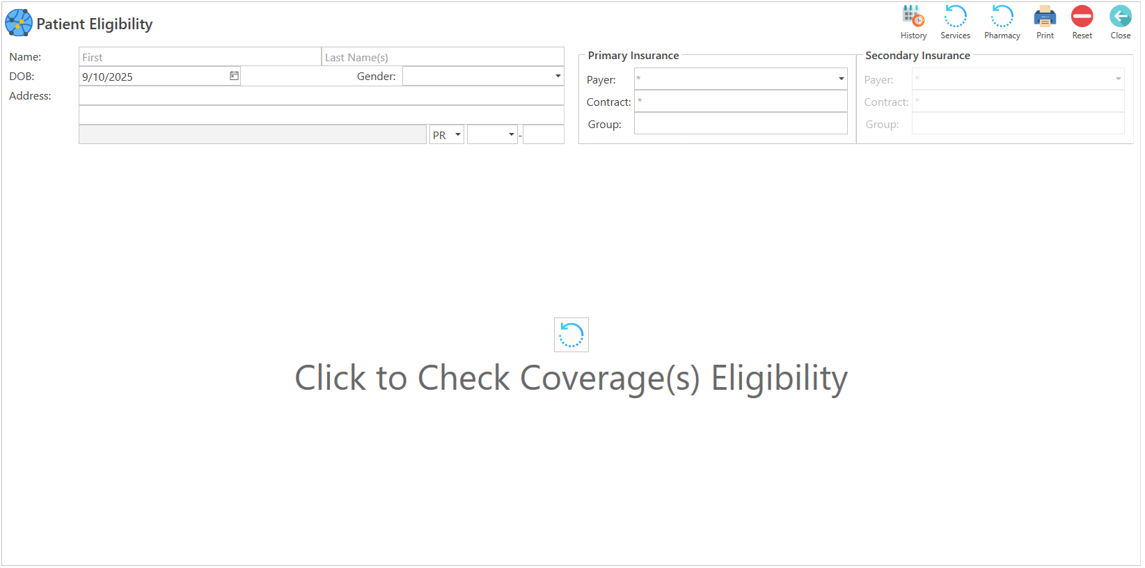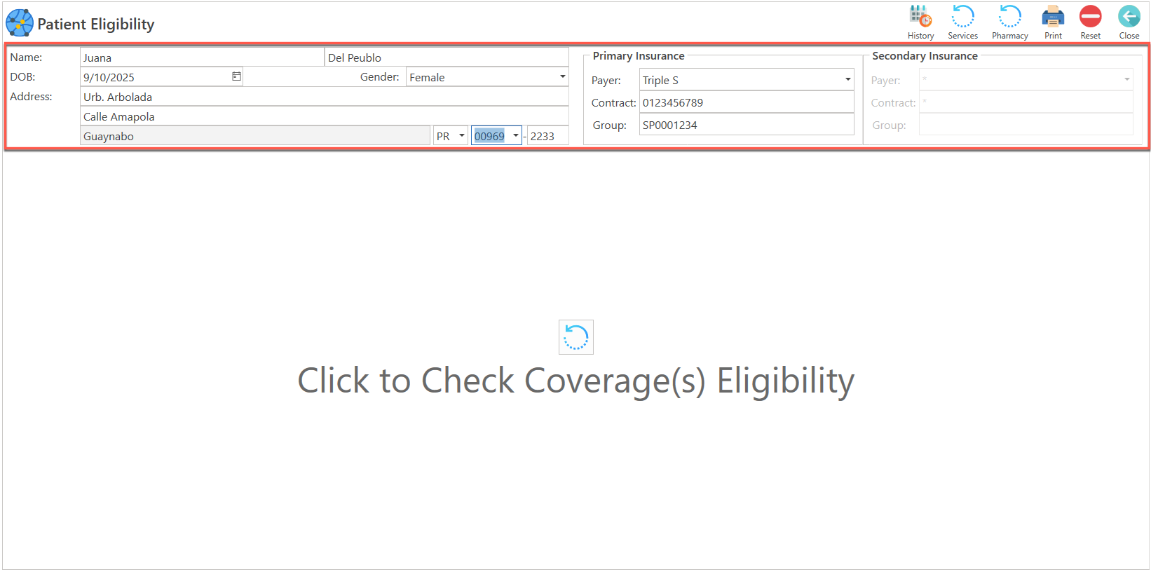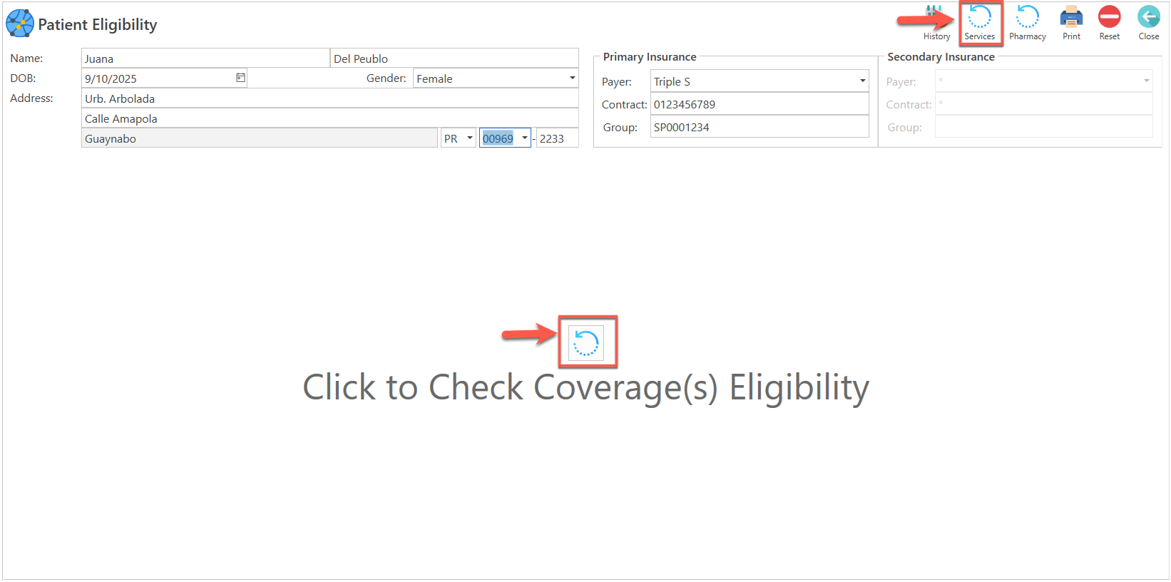 - Una vez registrada la información, presione el botón de "Services", localizado en la parte superior de la pantalla o presione el botón de "Click to Check Coverage Eligibility", localizado en el centro de la pantalla.