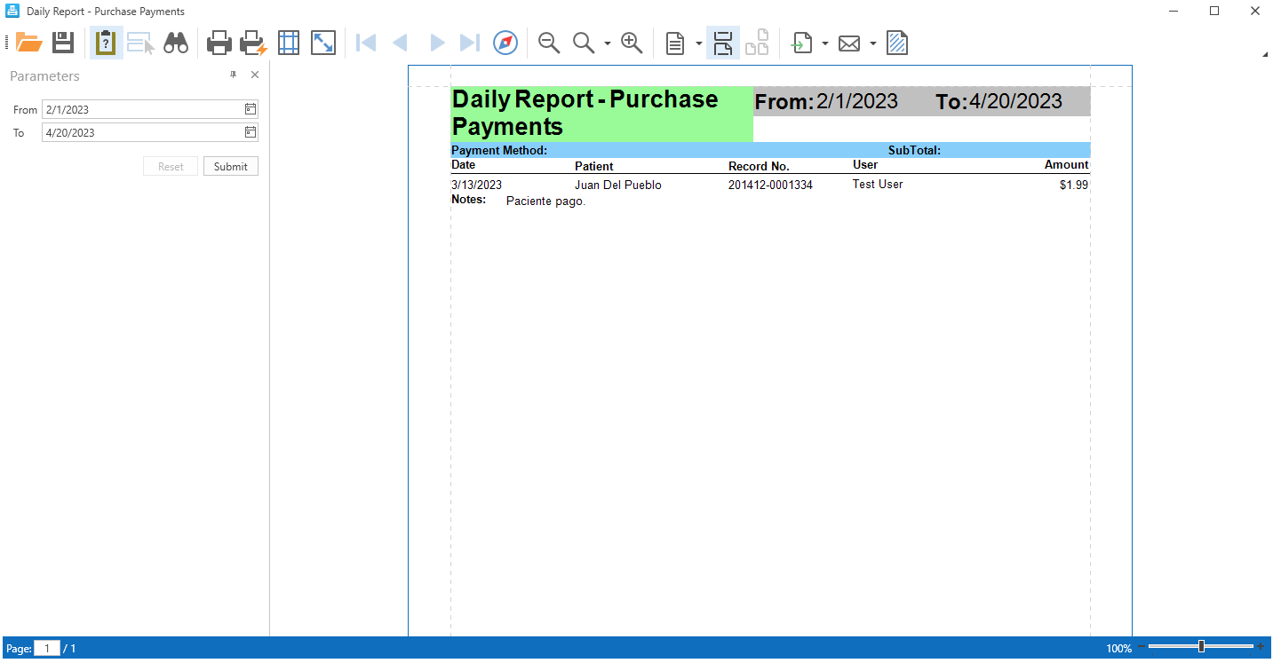Reporte diario de los pagos de productos, vendidos en la oficina o centro.