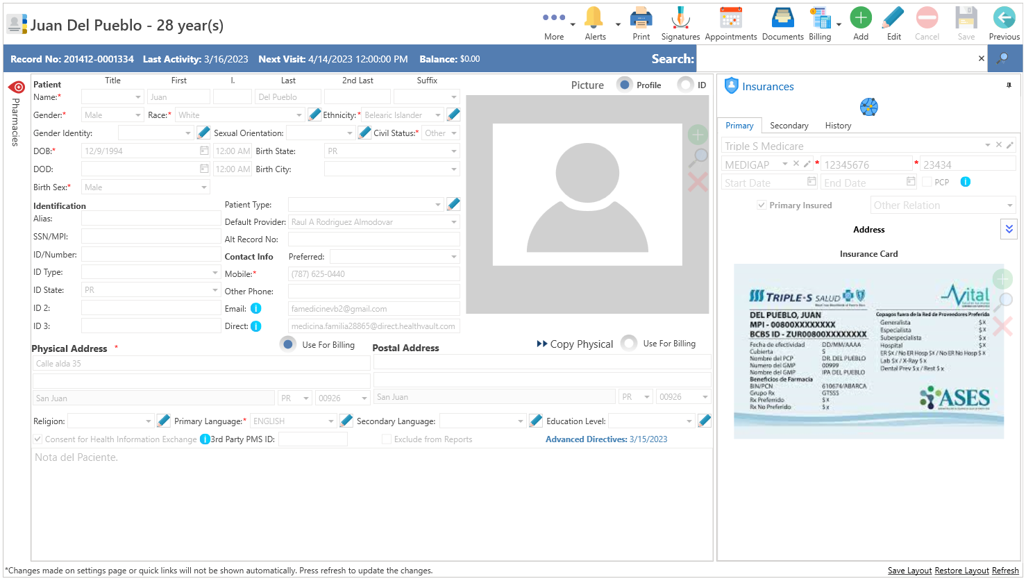 - Insurance: Displays the image of the primary and secondary medical plan of the selected patient.