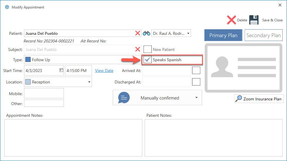- To send the text message in Spanish, ensure that the Speaks Spanish option is checked on the Appointment Details screen.