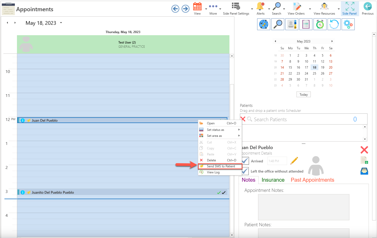 - Alternatively, right-click and choose the Send SMS to Patient option.