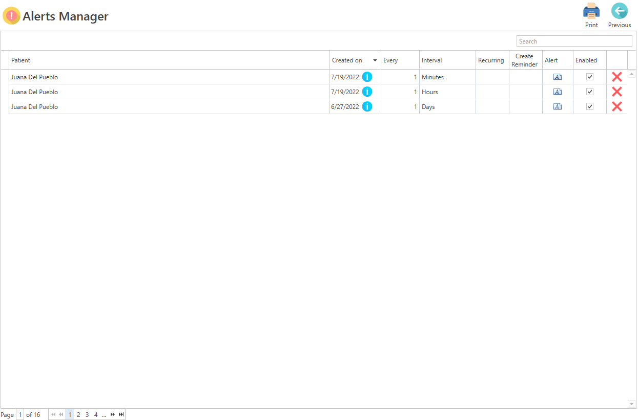 - Print: Allows you to print the report of all patient alerts.