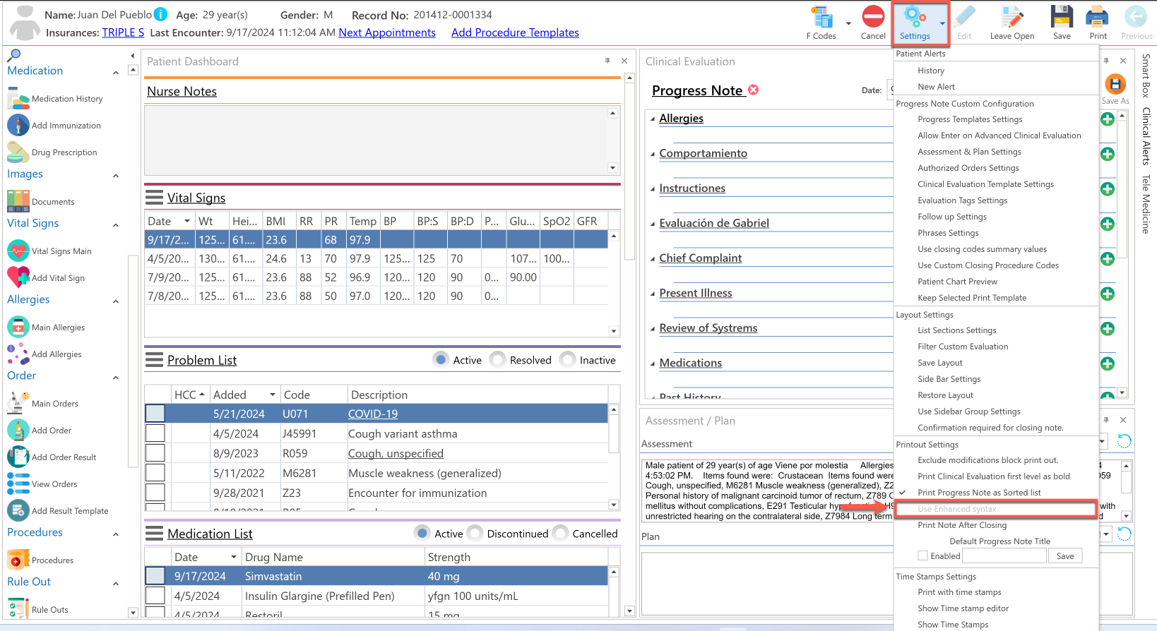 - Choose the Use Enhanced Syntax option in the Printout Settings section. (This option must be selected before starting the clinical evaluation.)