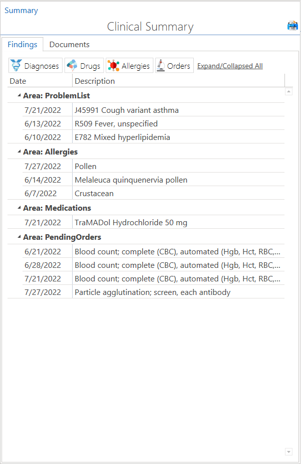 - Findings: Section displaying the patient's clinical summary, including diagnoses, medications, allergies, and orders.