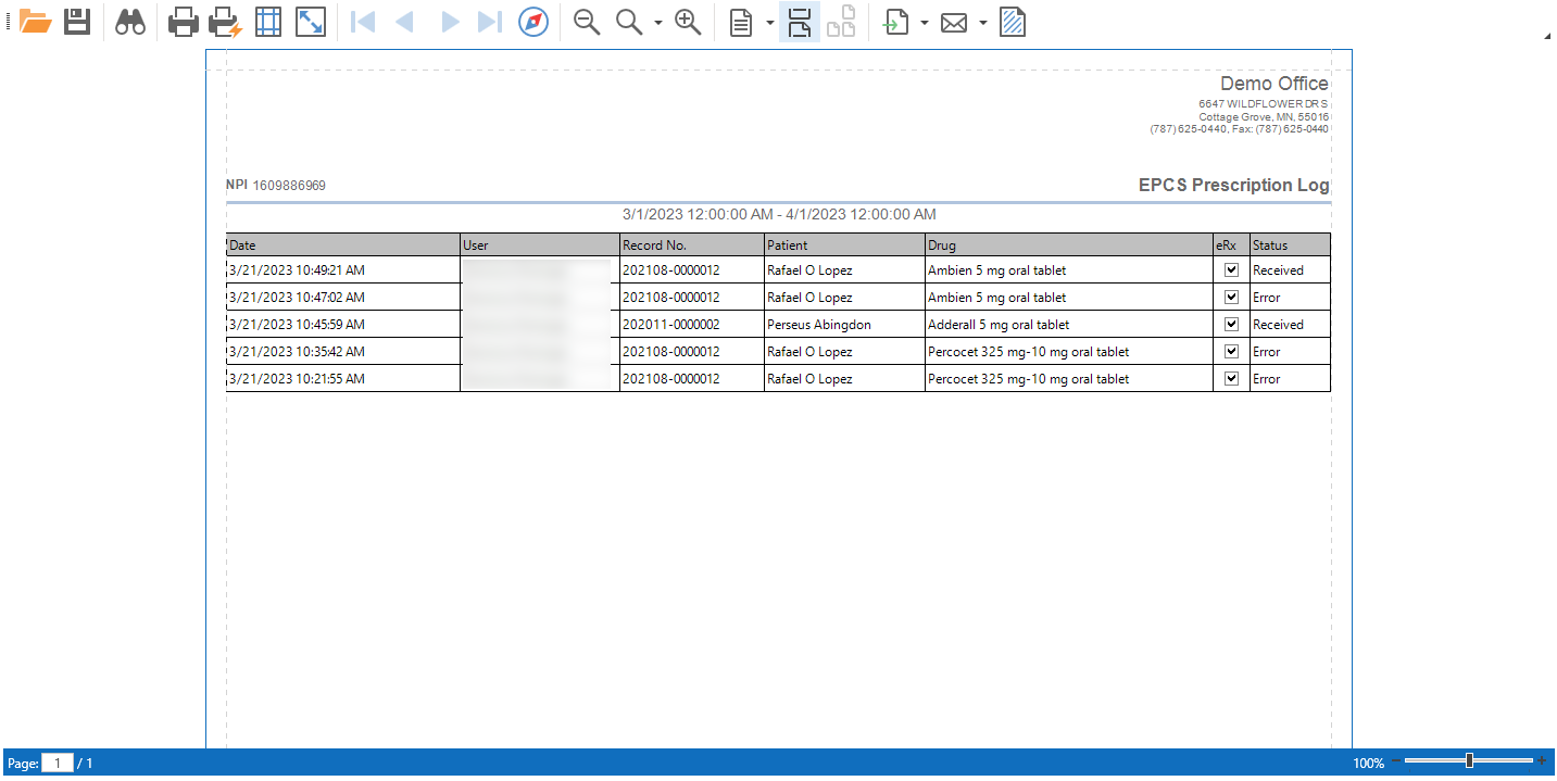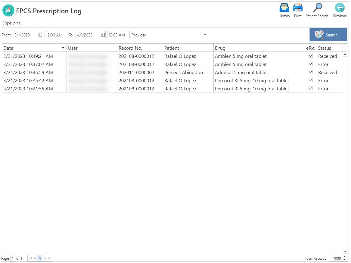 - History: Allows you to display the history of electronic prescriptions for controlled substances.