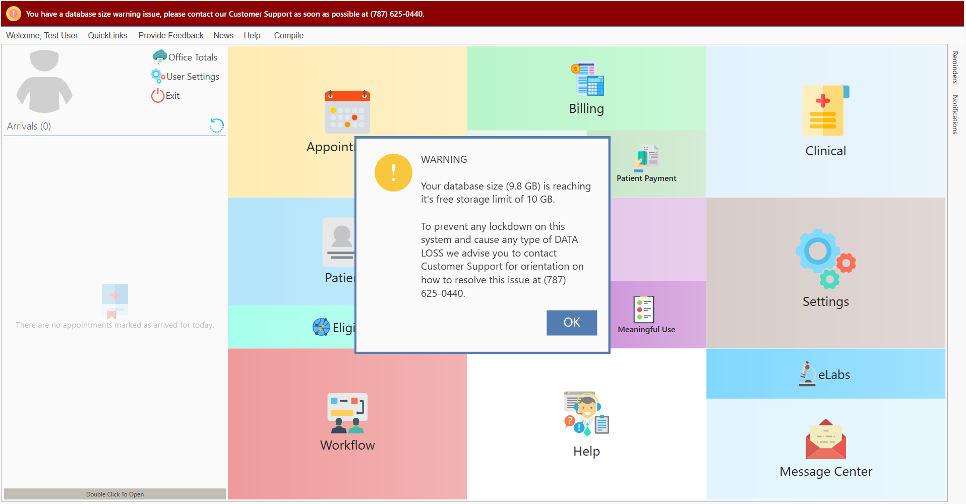 - New feature that identifies that the database is reaching its free storage limit. It is recommended to call our customer service department at 787-625-0440 for more information.