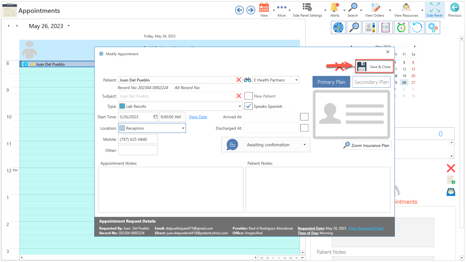 • Select the time you want the appointment. Once selected, press the Save & Close button.