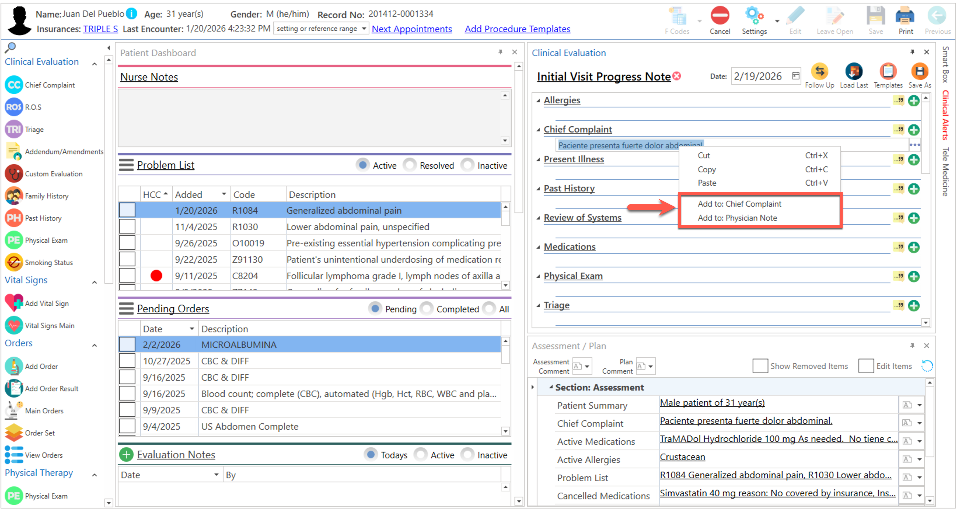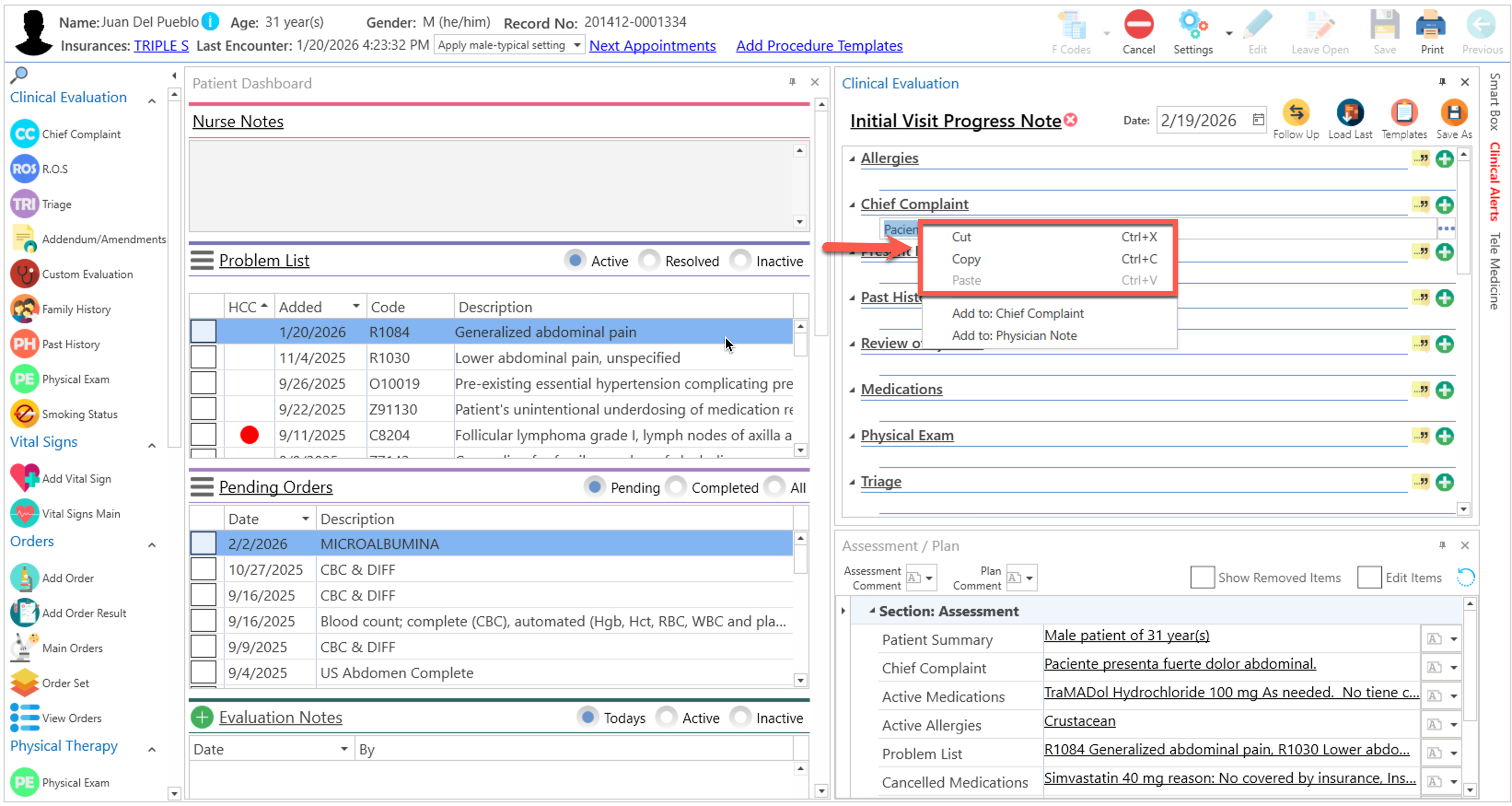 - Si desea mover o copiar una frase a otra sección de la evaluación clínica, simplemente proceda a sombrear y haga clic con el botón derecho del "mouse". Elija la opción "Cut" si desea eliminar la frase del área actual y trasladarla a otra sección, o seleccione "Copy" si solo quiere duplicarla en otra parte de la evaluación clínica.