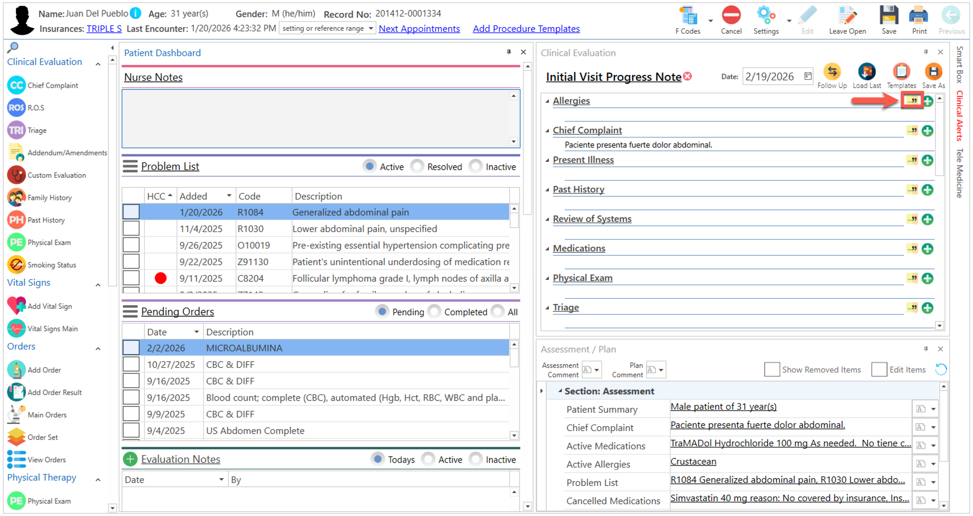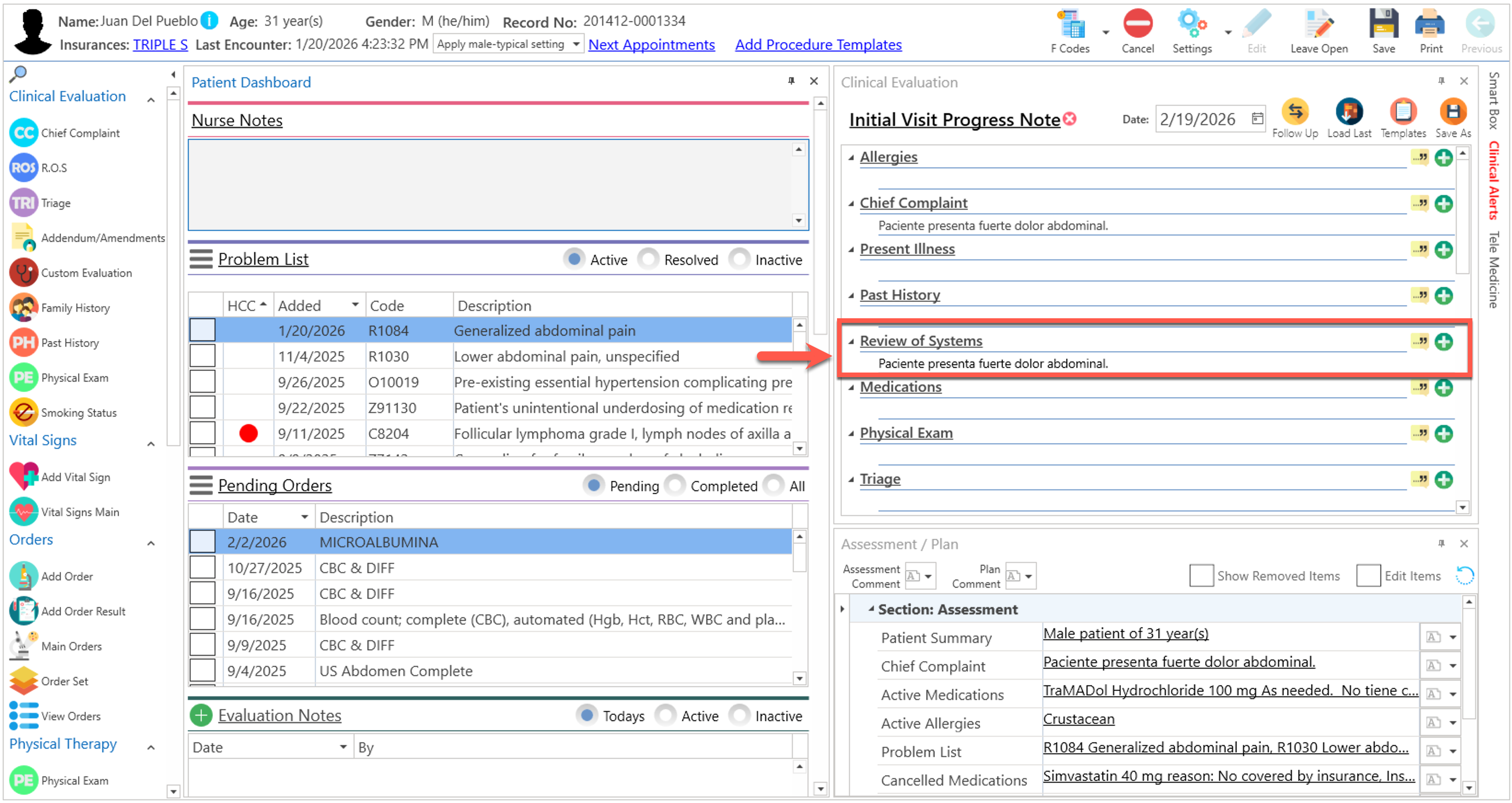 - Automáticamente, pasarán a la pantalla de "Phrases Editor" y a su vez a la etiqueta, en la evaluación clínica. Para este ejemplo, se creó la frase, en la etiqueta de "Review of Systems".