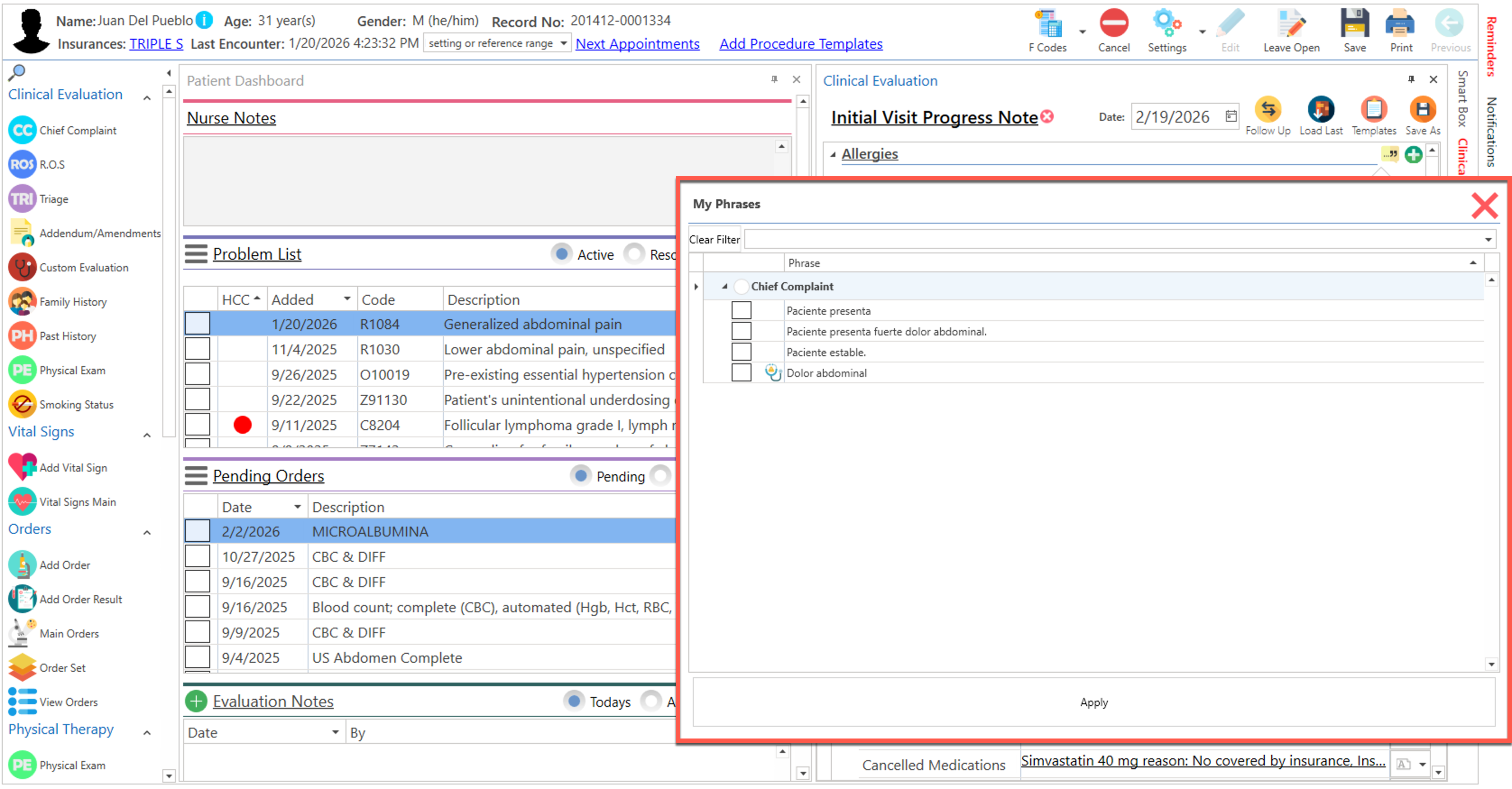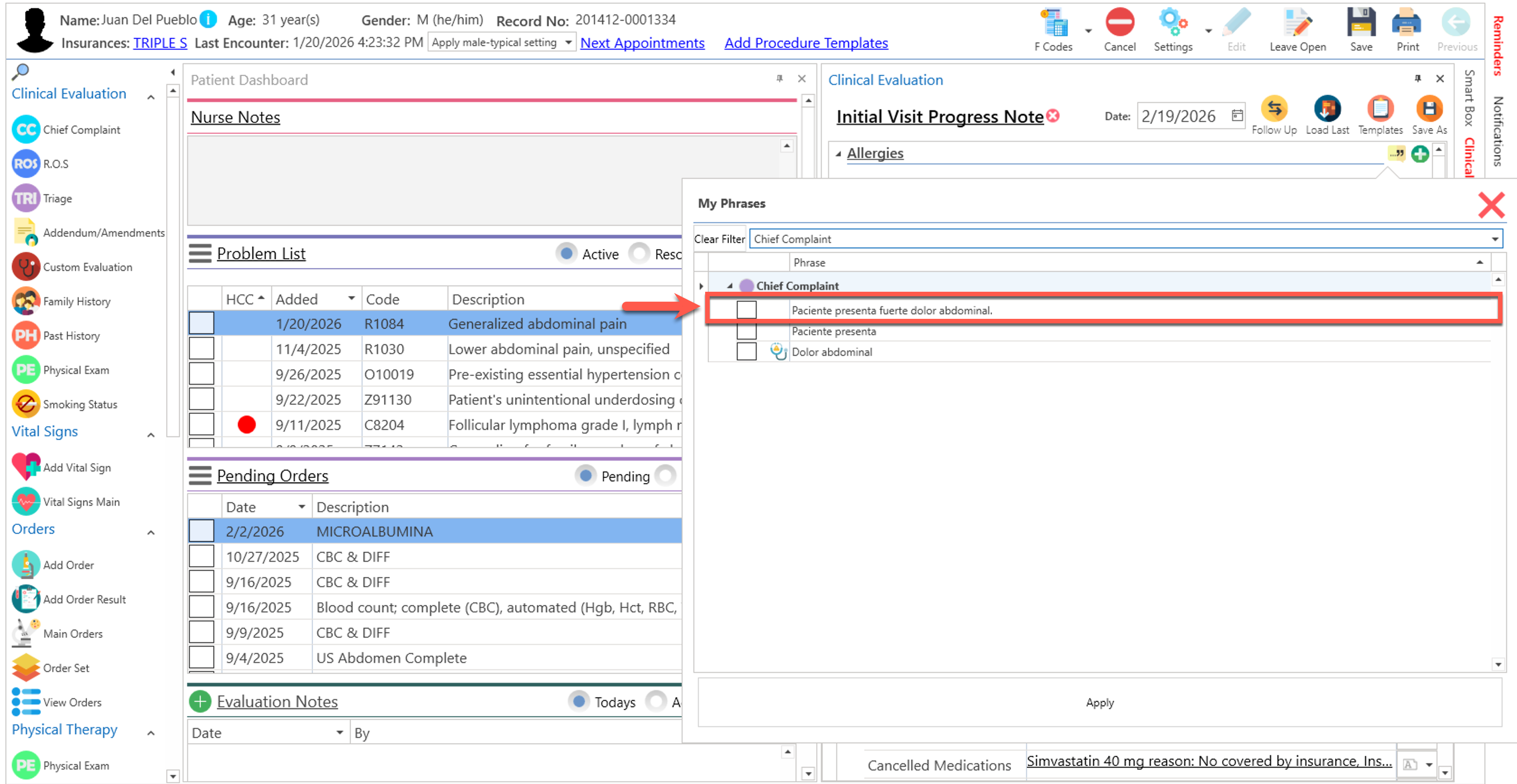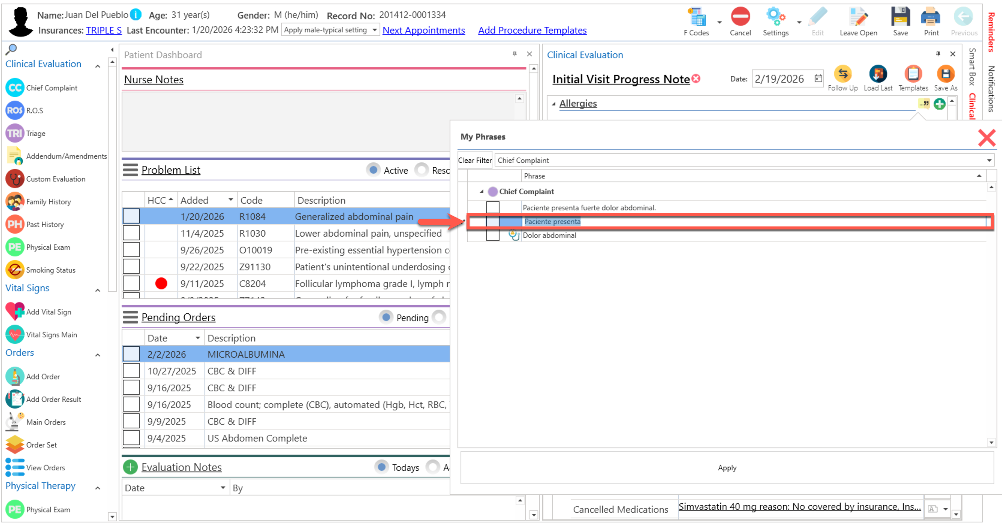 - Conociendo el área de: Advanced Progress Note / Settings / Phrases Settings