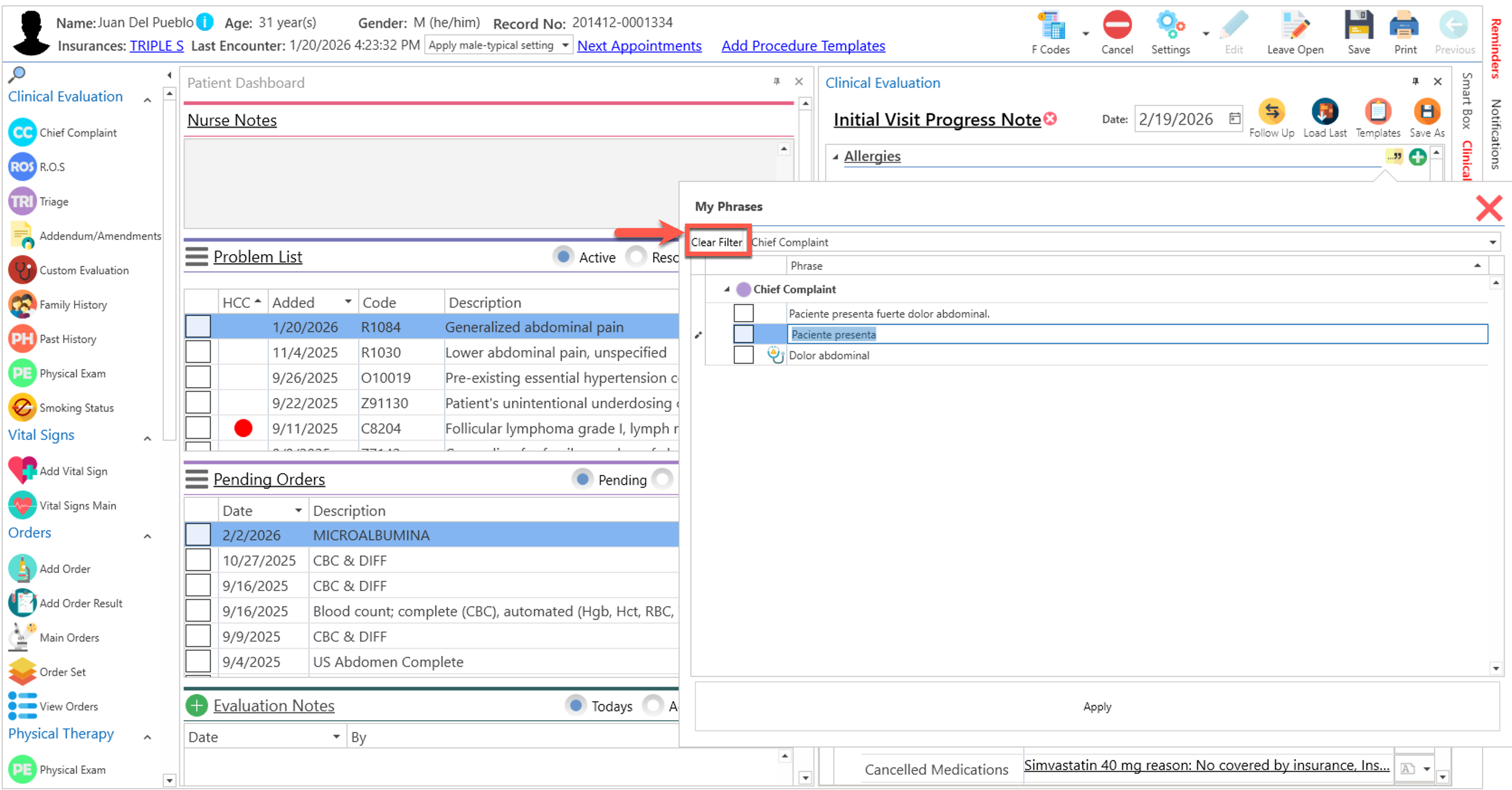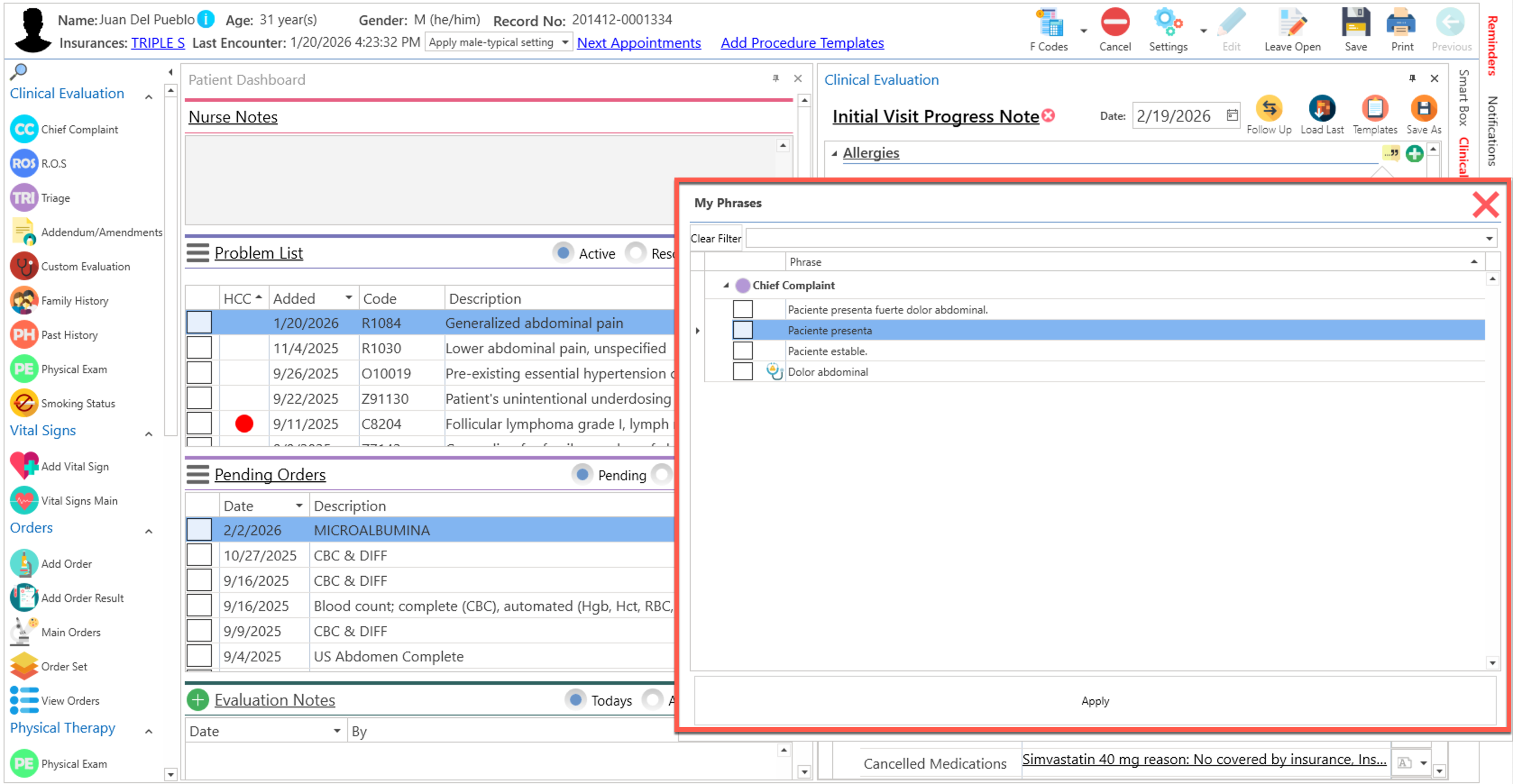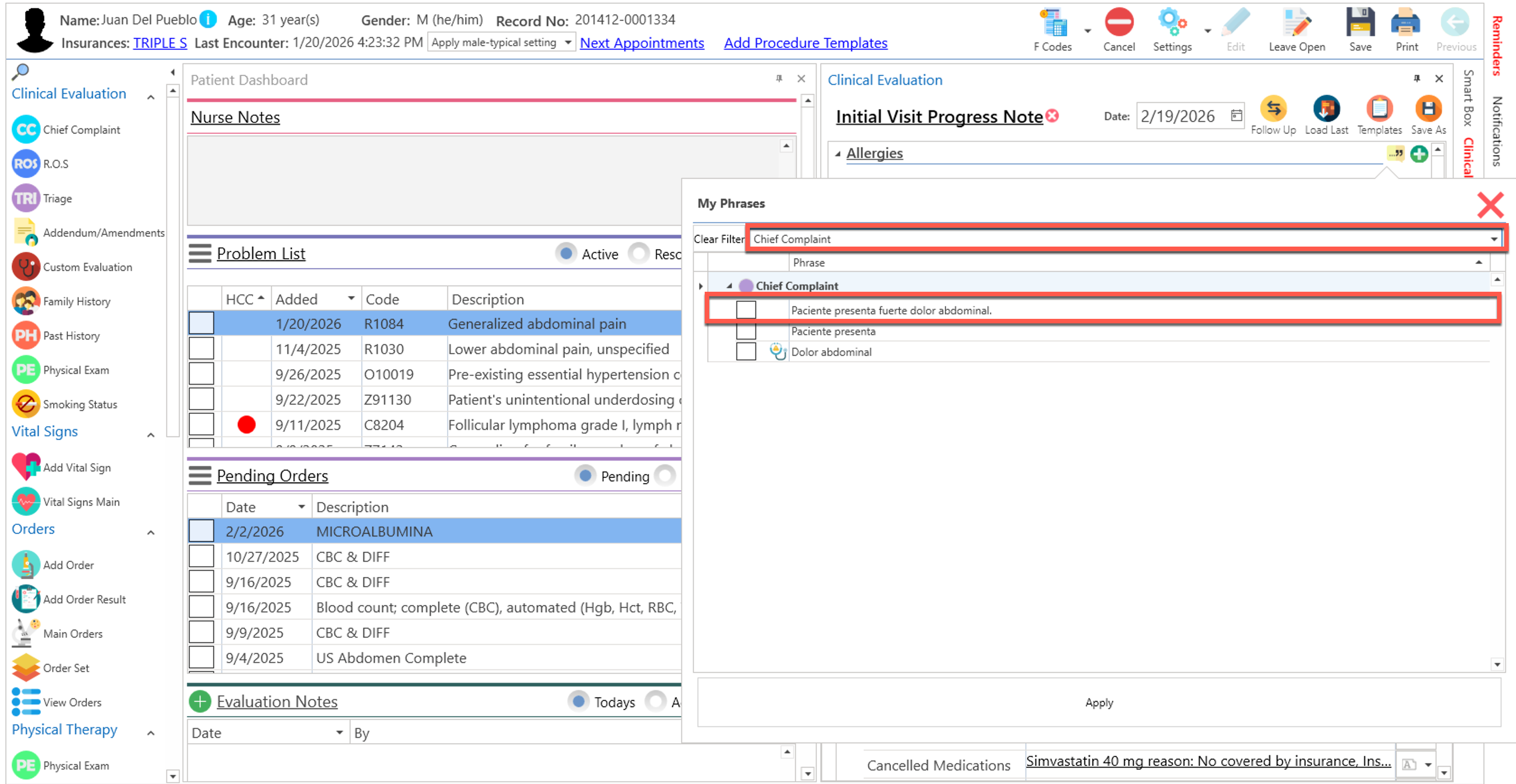 - Conociendo el área de: Advanced Progress Note / Settings / Phrases Settings