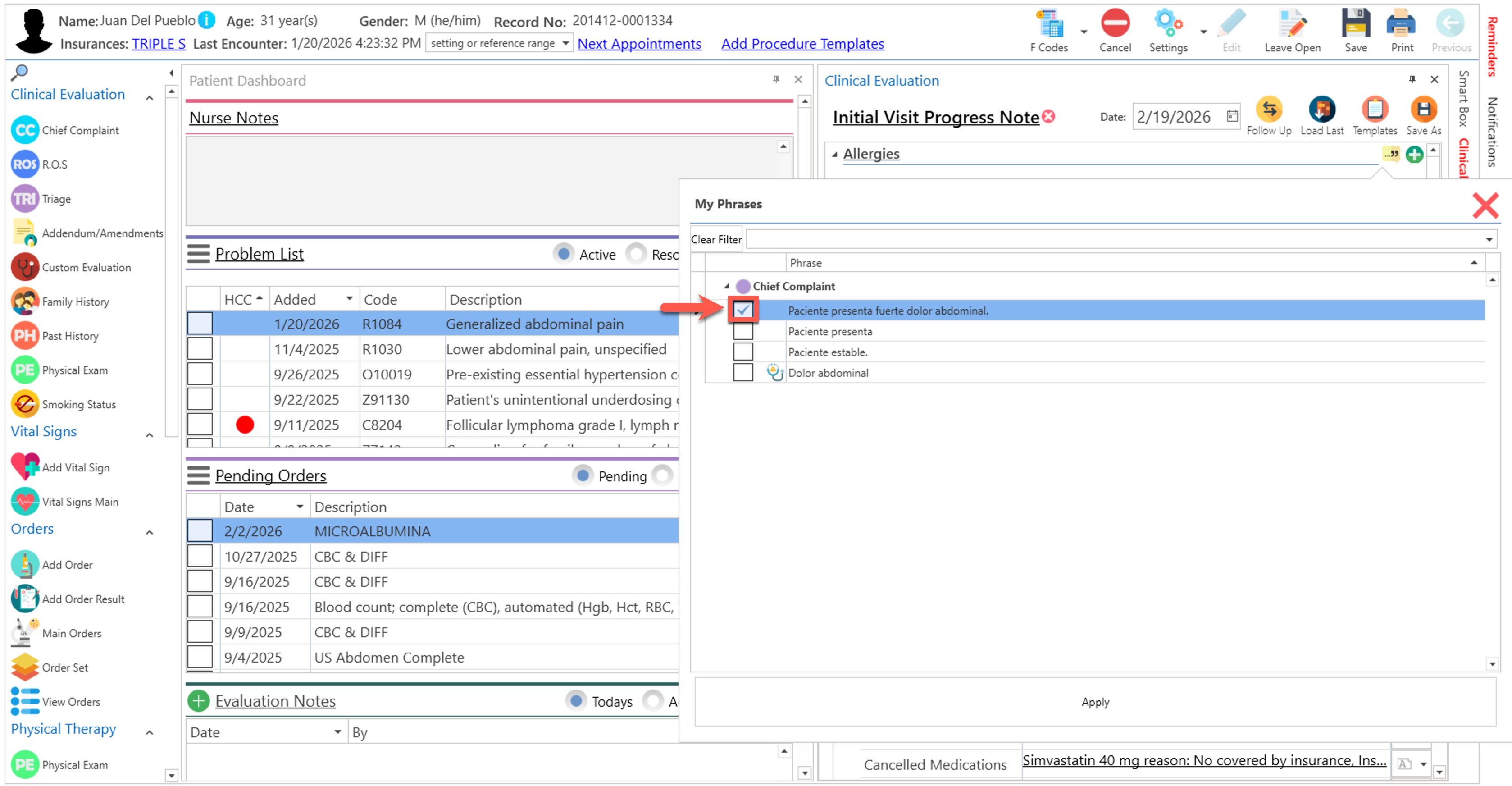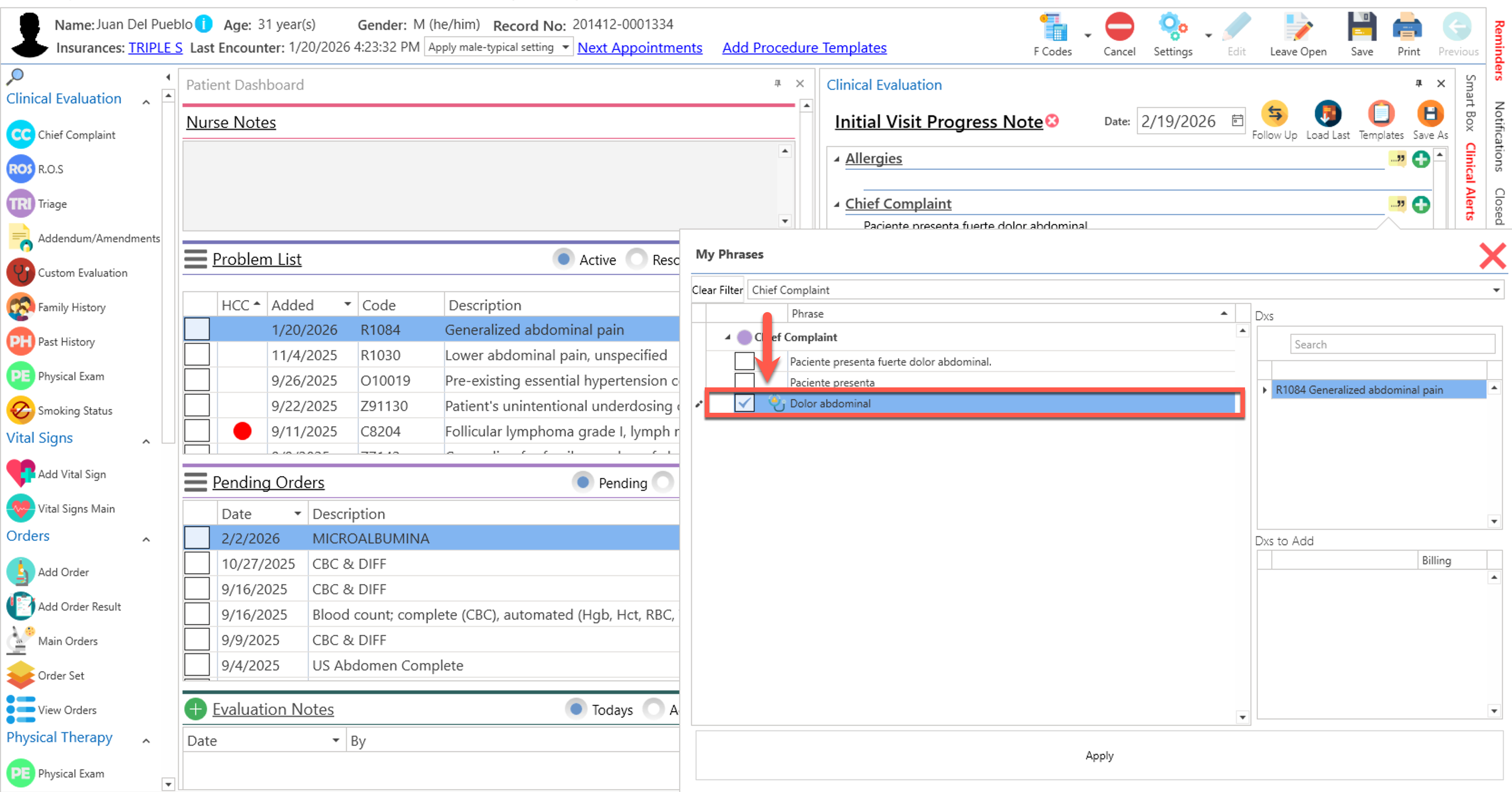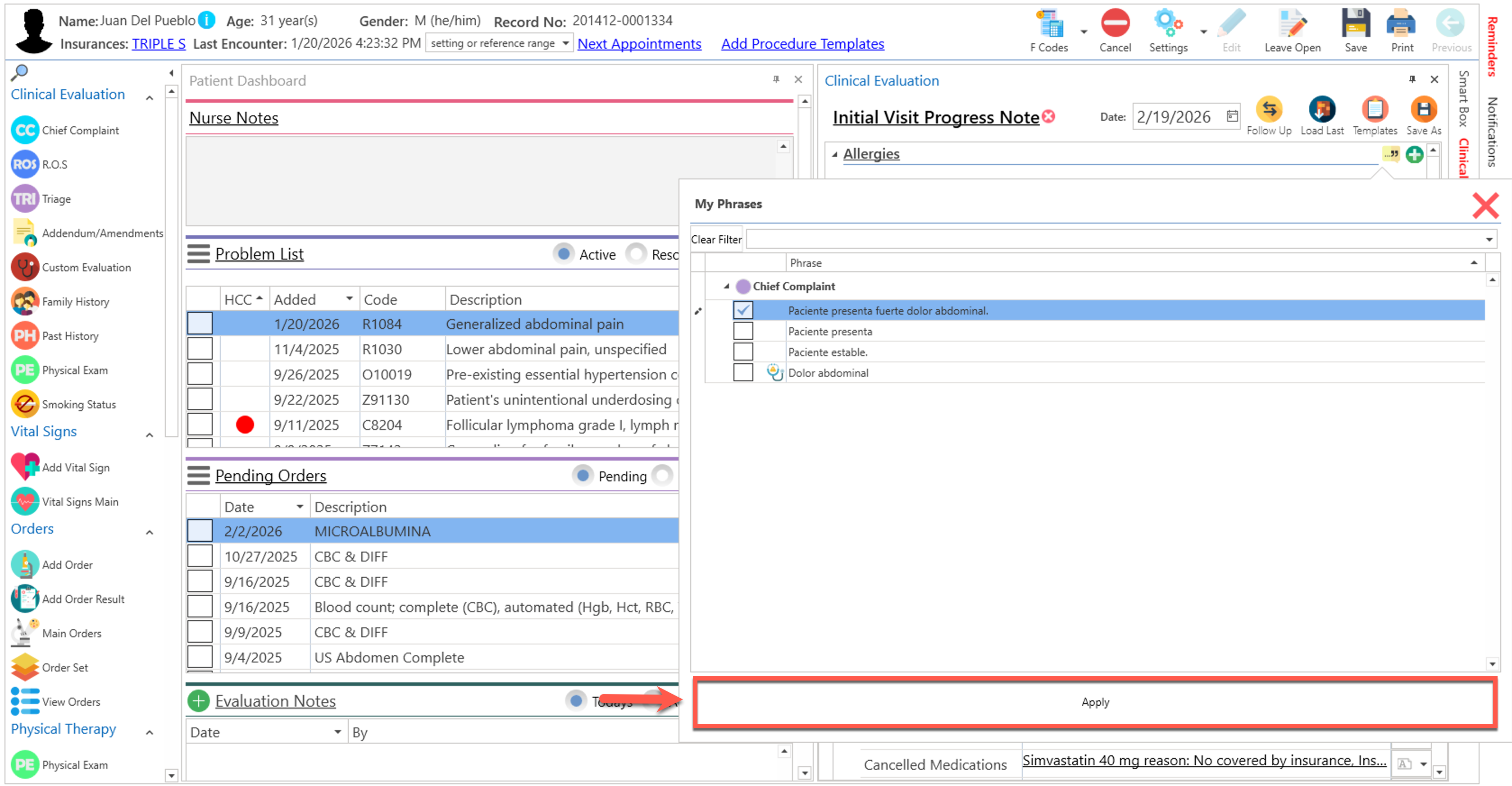 - Luego de seleccionar la frase, presione el botón de "Apply" para ser agregada a la evaluación clínica.