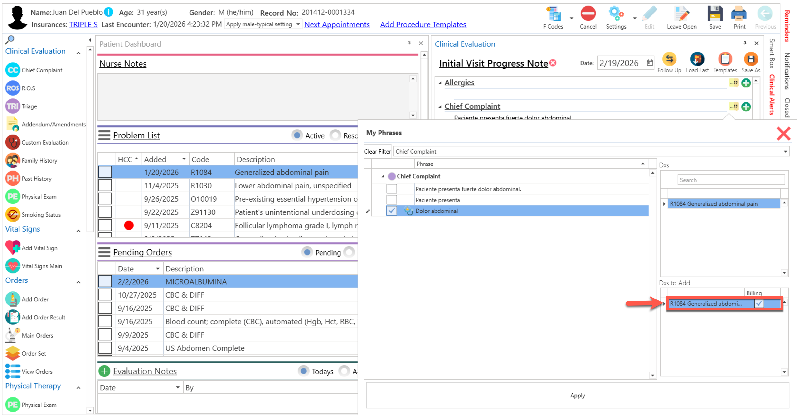 - Automáticamente, se muestran los diagnósticos asociados a la frase seleccionada. Para elegir un diagnóstico, haga doble clic sobre el mismo, y este se trasladará a la sección de "Dx to Add".